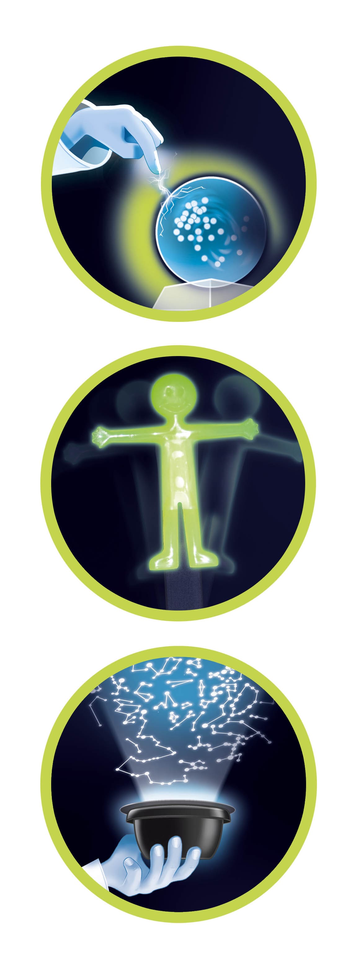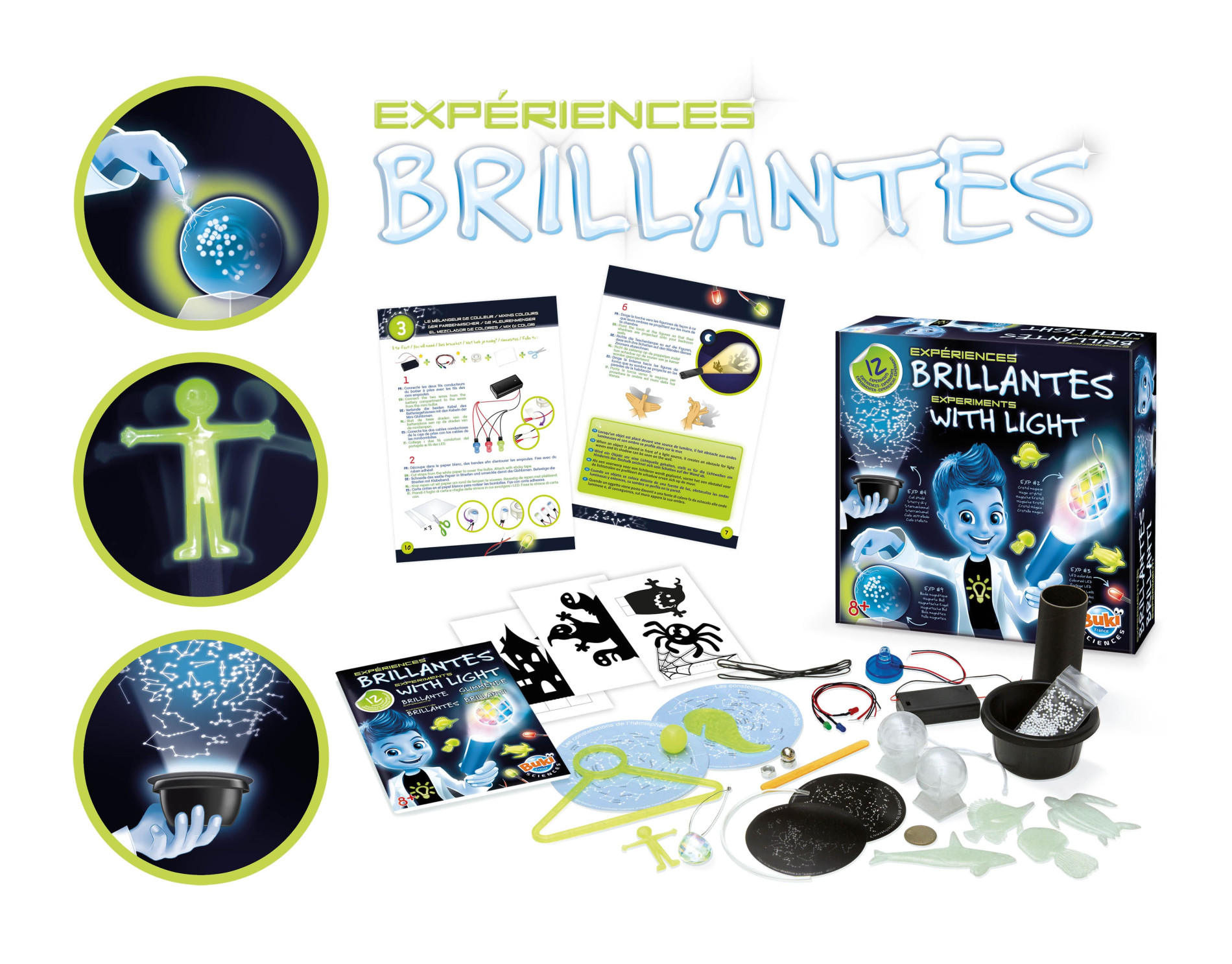 Комплект за деца, който съдържа 12 изненадващи и иновативни експерименти, които трябва да бъдат направени на тъмно, така те ще разкрият магията на светлината, силата на цветовете и сенките;