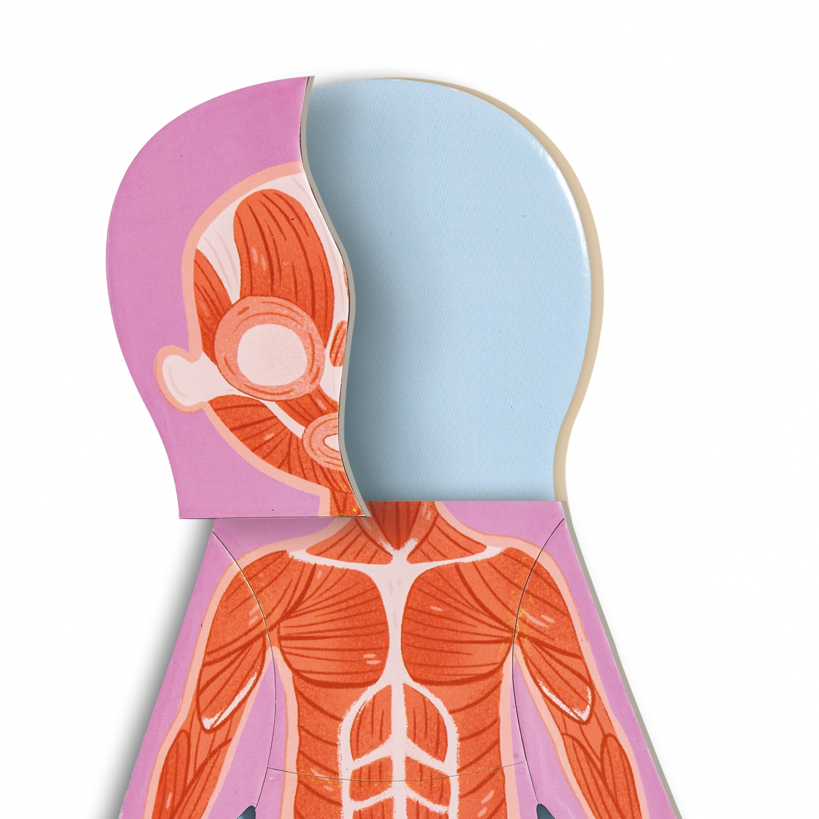 Комплектът включва дървена стояща основа, тяло, магнитни части за тяло за момче и момиче, скелет, кръвоносна система, мускулна система, нервна система с органи и шест двустранни карти с човешко тяло;