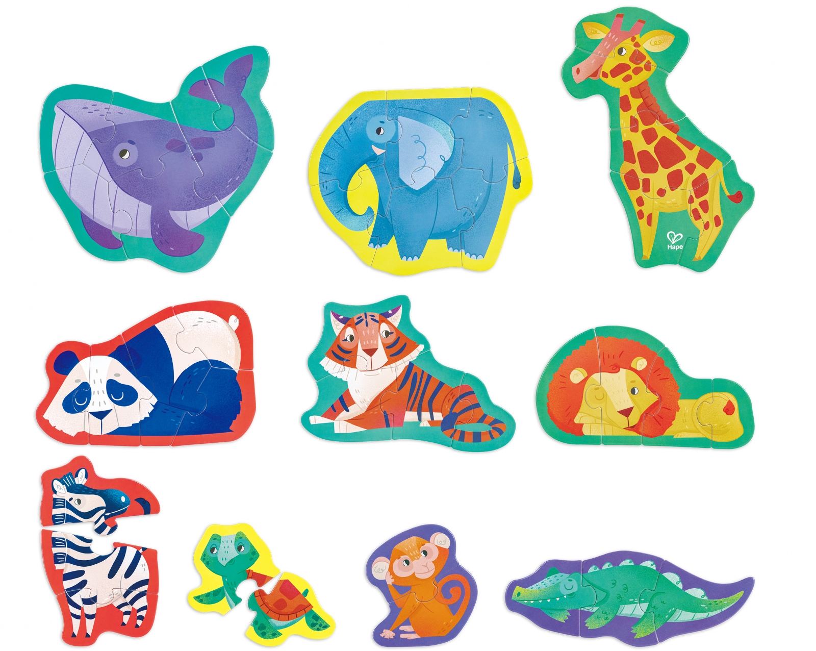 Сглобете частите и научете всички харектерни белези за всяко от животните, зебра, слон, крокодил, костенурка, кит, жирав, маймуна, тигър, лъв и панда;
