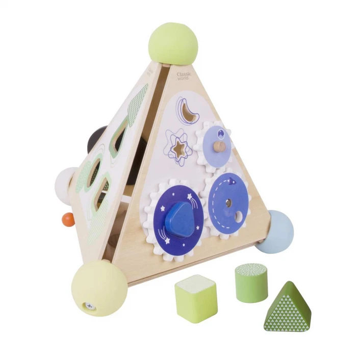 Всяка страна на пирамидата предоставя възможност за различни игри - музикалната част има различни бутони със звуци, ксилофон и звънец, а другата е направена така, че да се научат да разпознават фигурите;