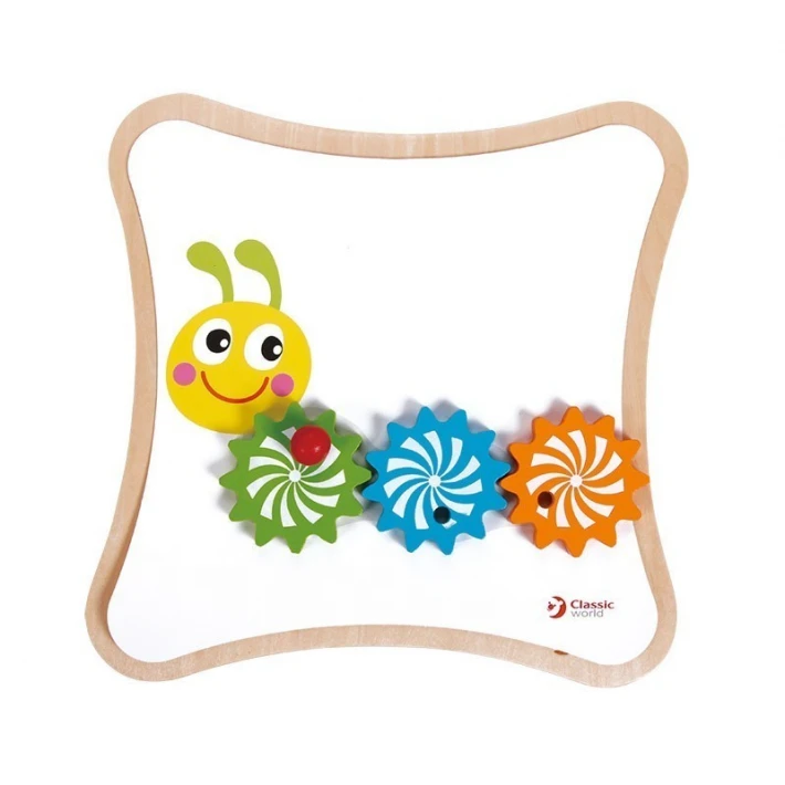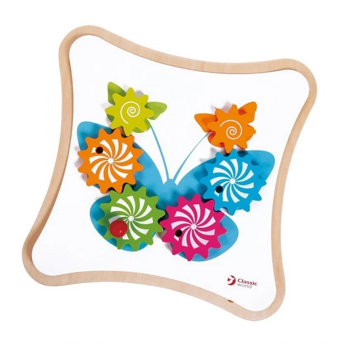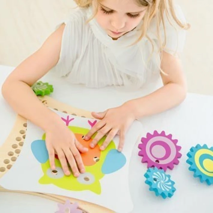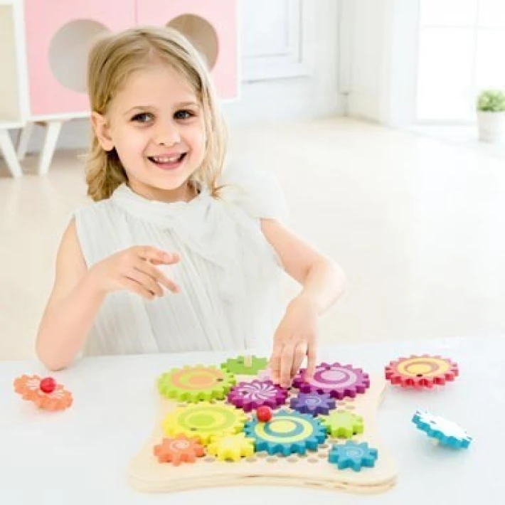 Комплектът включва 18 части - различни по големина и цвят зъбчати колела, топченца и идейни карти с картинки за довършване, добавяйки им от колелата;