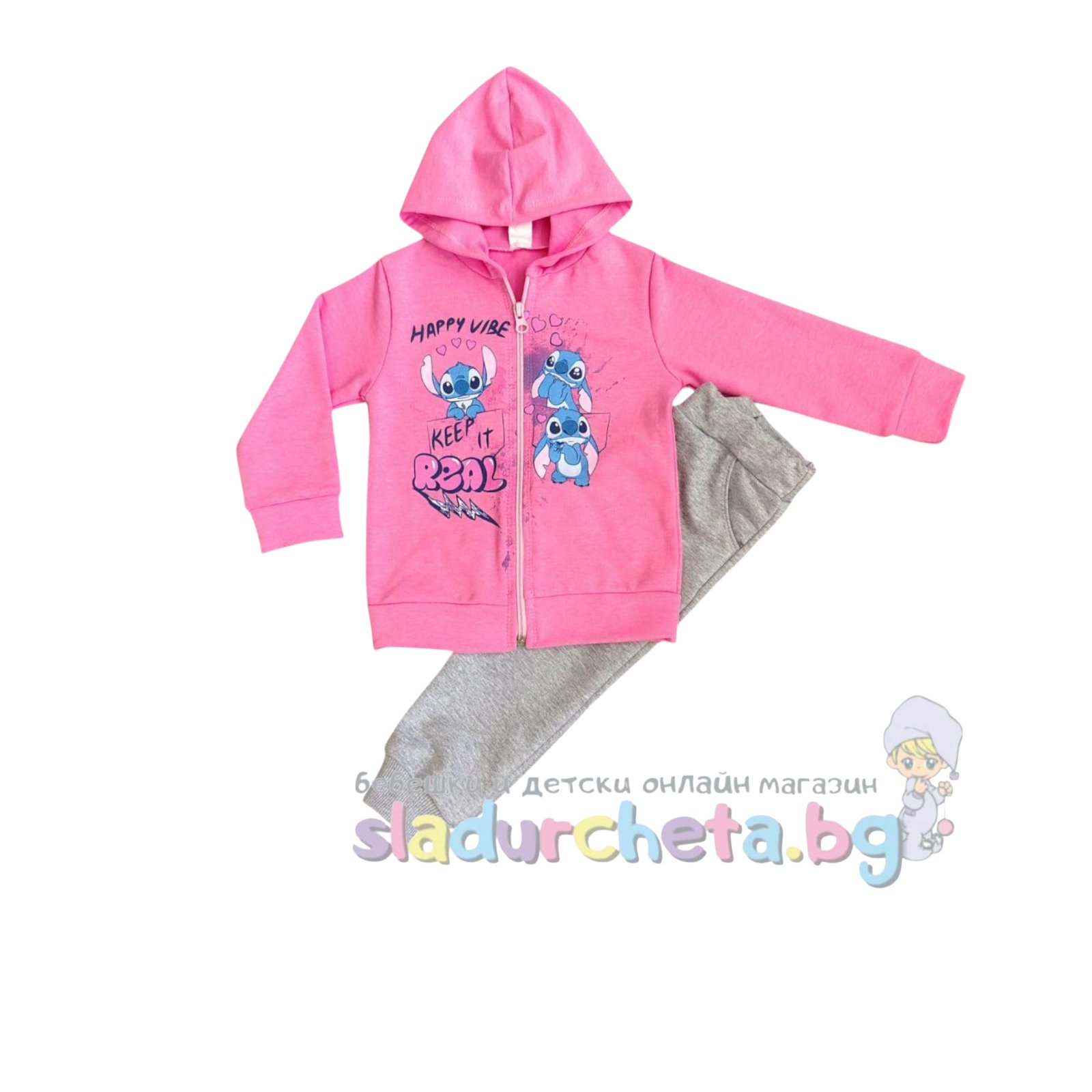 Суитшъртът е с качулка, с дълъг ръкав в розов цвят с цветна апликация на Стич;