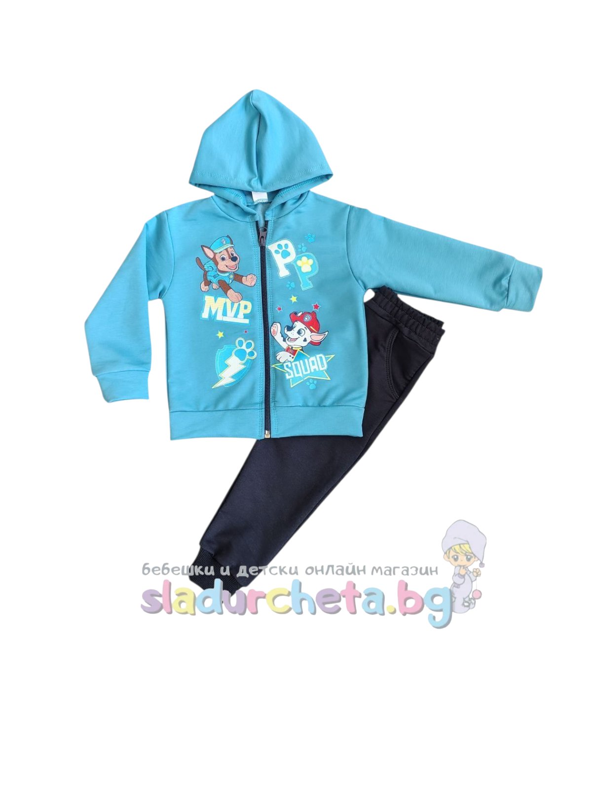 Суитшъртът е с качулка и дълъг ръкав в светлосин цвят с апликация на кученцата от Пес Паструл;