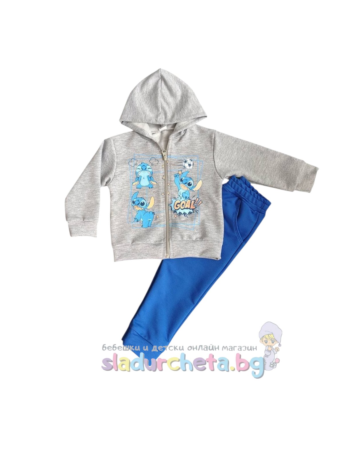 Суитшъртът е с качулка и дълъг ръкав в сив цвят с апликация на кученцата от Стич;