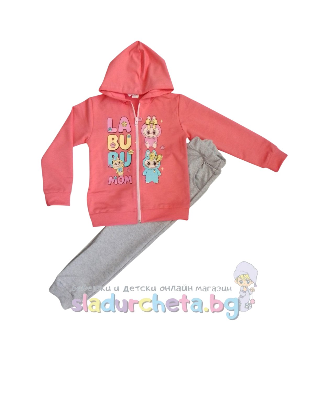 Суитшъртът е с качулка и дълъг ръкав в цвят корал с цветна апликация на Labubu;