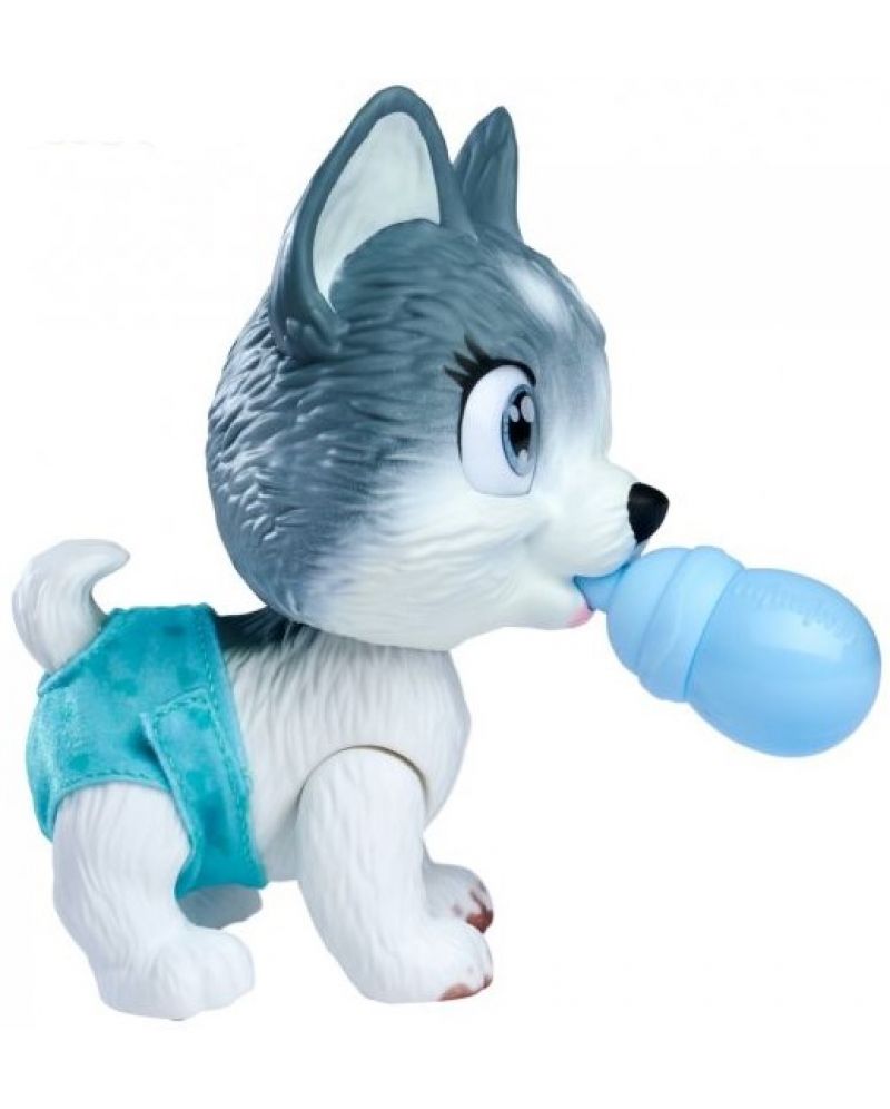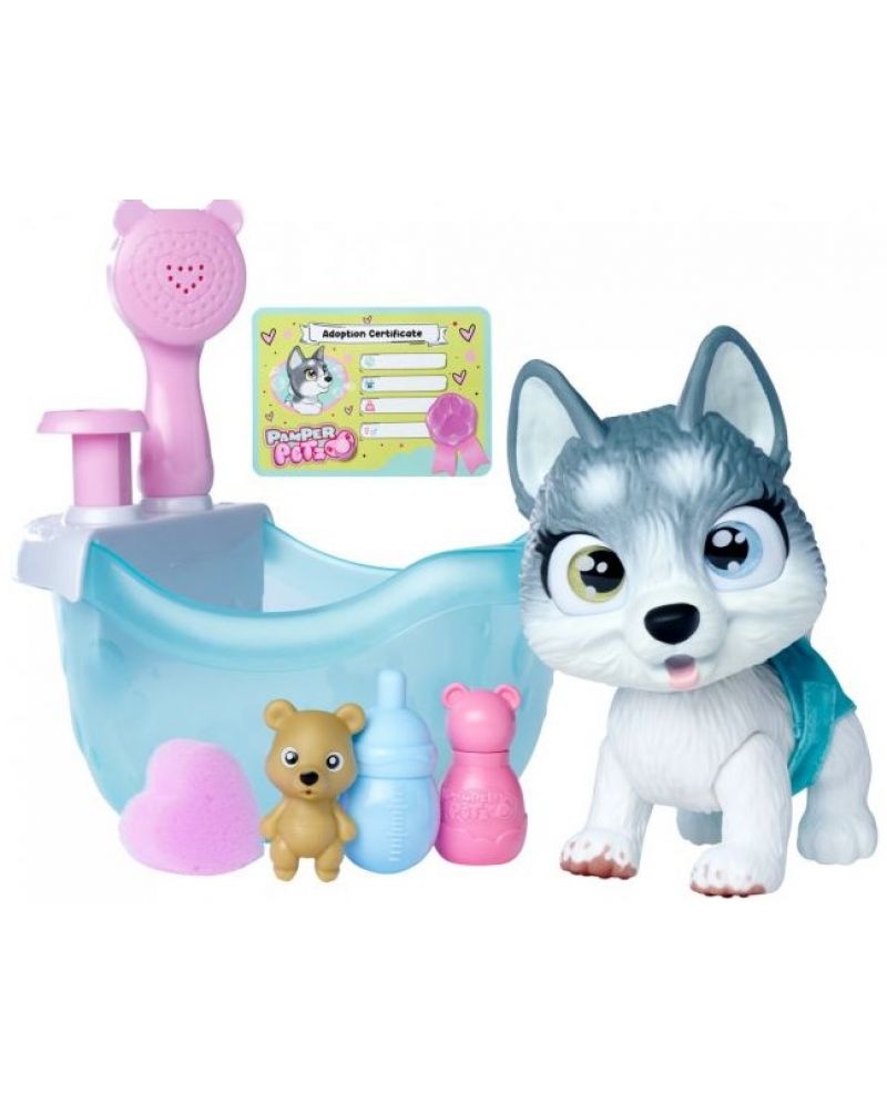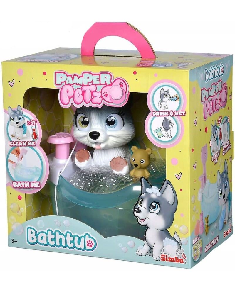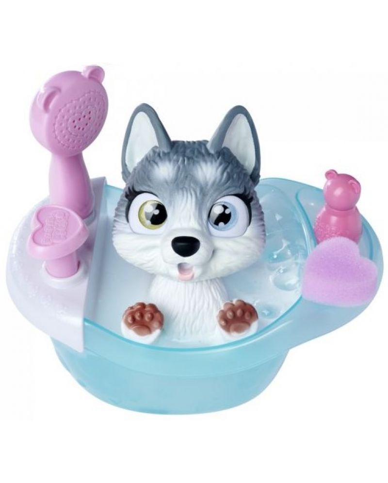 В комплекта за игри има куче хъски, малко плюшено мече и вана с аксесоари, в която можете да миете кучето;