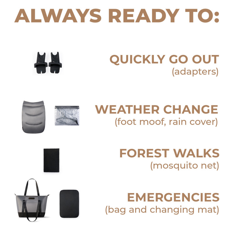 Благодарение на включените адаптери за столче за кола, можете лесно да прикрепите седалката към шасито на количката за бързи пазарувания или кратка разходка;