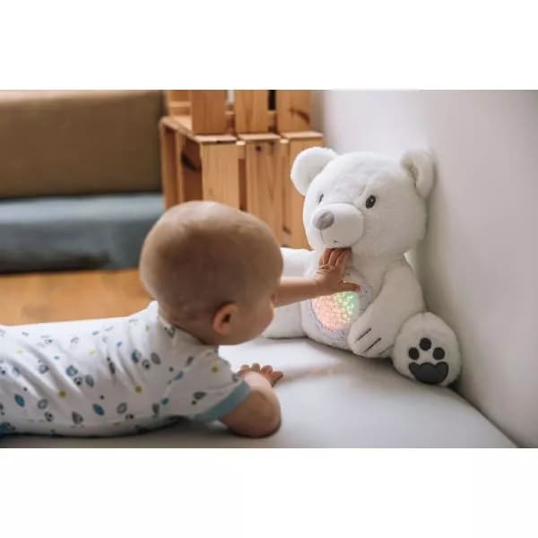 • Този мек, пухкав плюшен приятел разполага с 6-цветна прожекция, 10 успокояващи мелодии, 10 приспивни песни, 5 звука с бял шум и 5 регулируеми нива на звука;