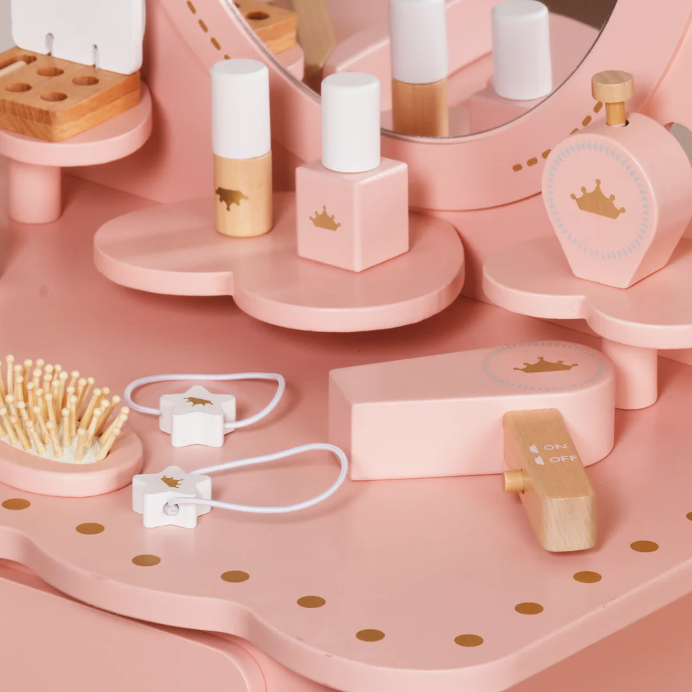 В комплекта са включени аксесоари за грим и игра – гребен, сешоар, преса за коса, парфюм, лак и други детски принадлежности, които правят тоалетката още по-реалистична и увлекателна за ролеви игри;