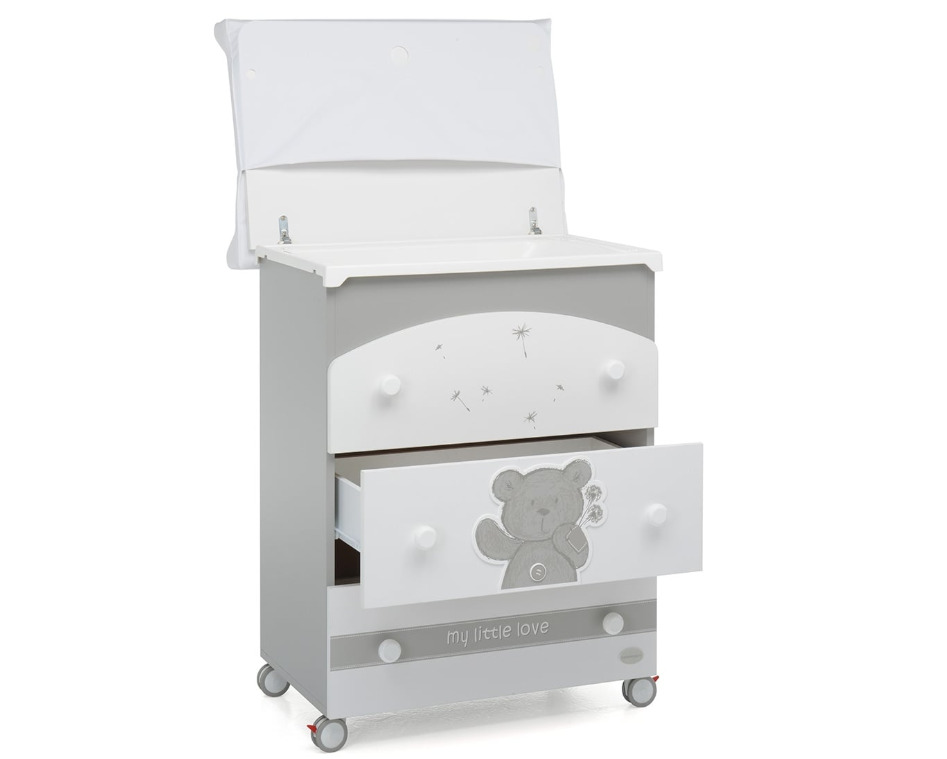 Оборудвана е с подвижна вана, с тръба и кран за източване, сгъваем рафт с омекотена предпазна система и практична подложка за повиване;