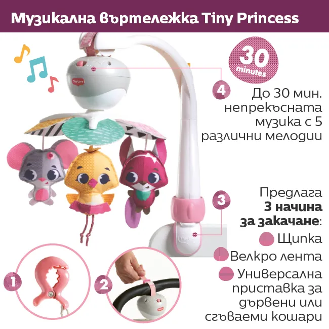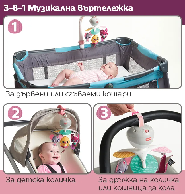 Въртележка 3 в 1: може да се постави на легълца и кошари, на кошници за кола и колички, кошове за новородено;