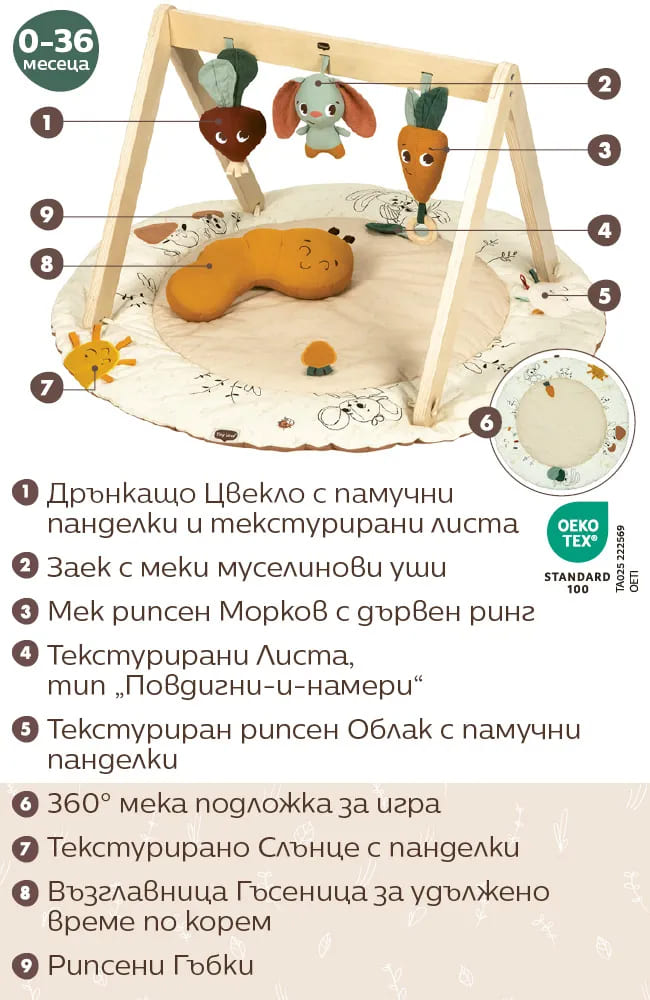 • Кръгло килимче за игра с размер 90 см в диаметър;
