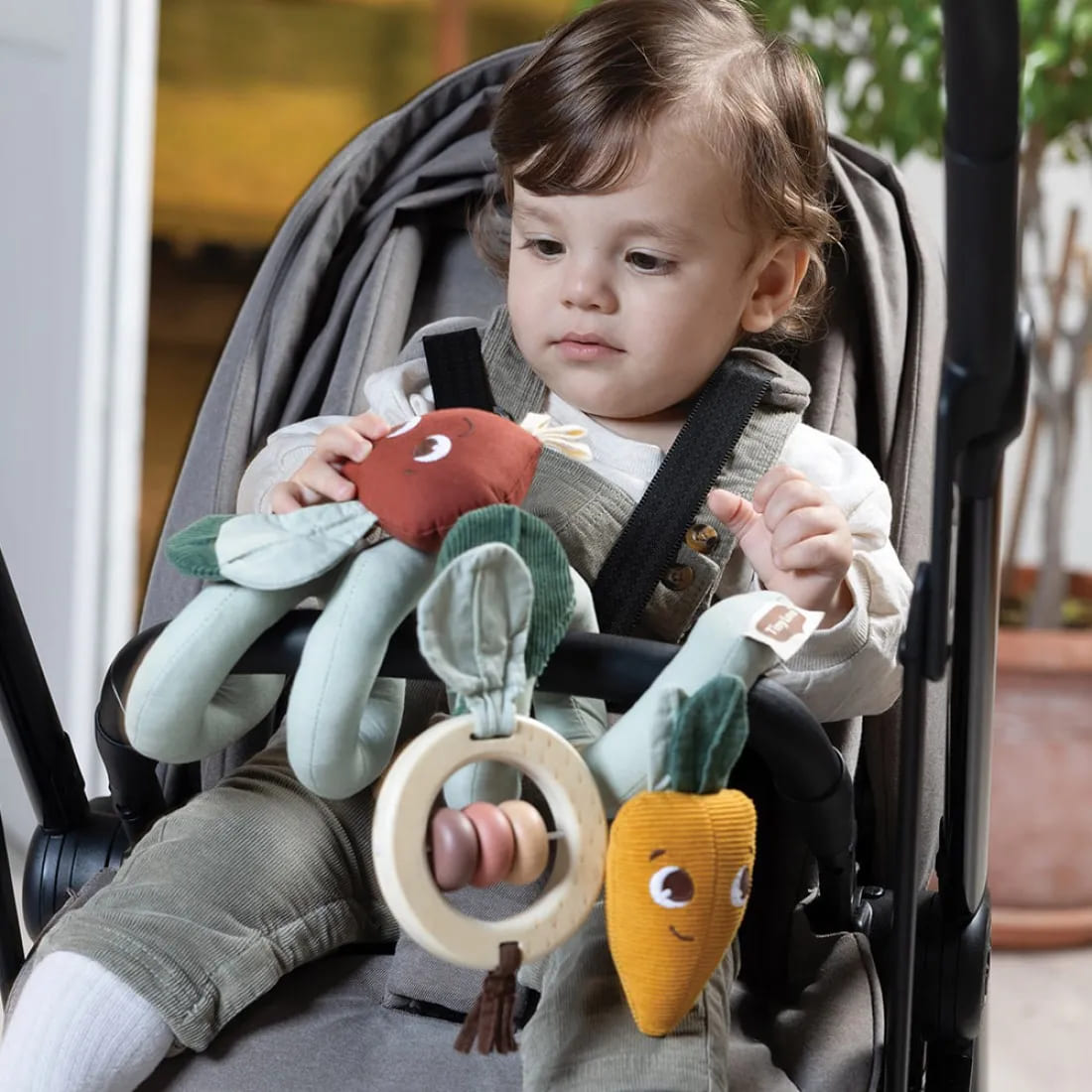 Играчка Цвекло с памучни панделки и текстурирани листа от муселин и памук – меки на допир текстури, които стимулират фината моторика;