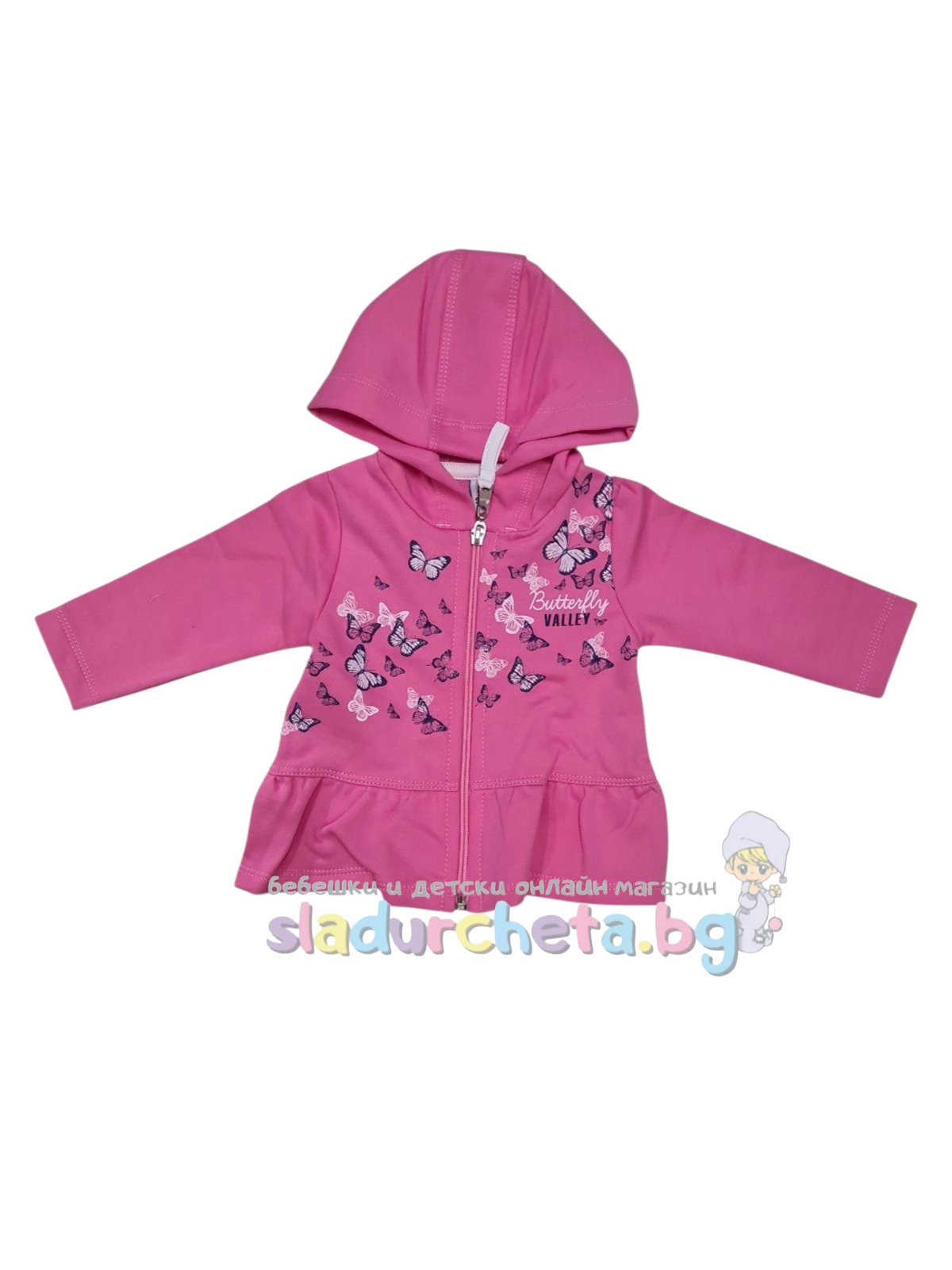 Суитшъртът е с дълъг ръкав и качулка в цвят циклама с щампа на пеперуди и широка долна част;