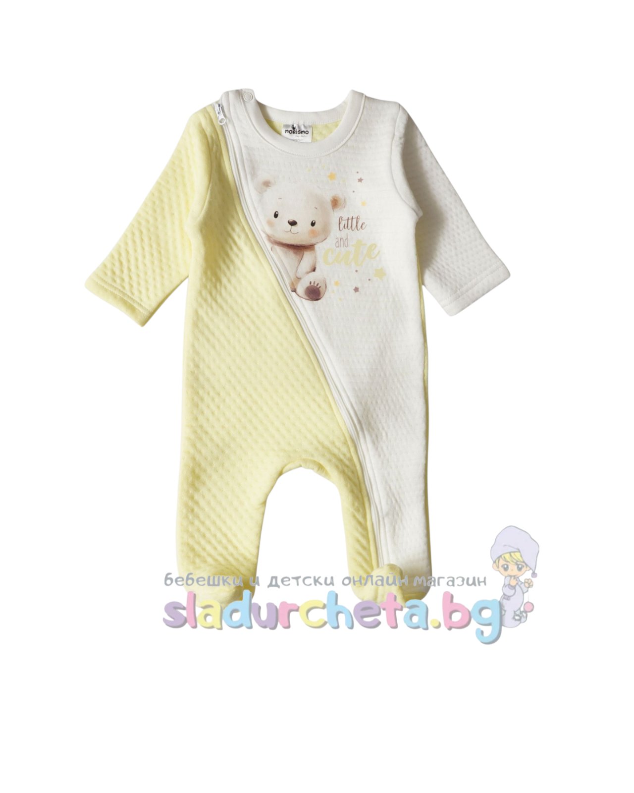 Гащеризонът е с дълъг ръкав в жълт и бял цвят с апликация на мече;