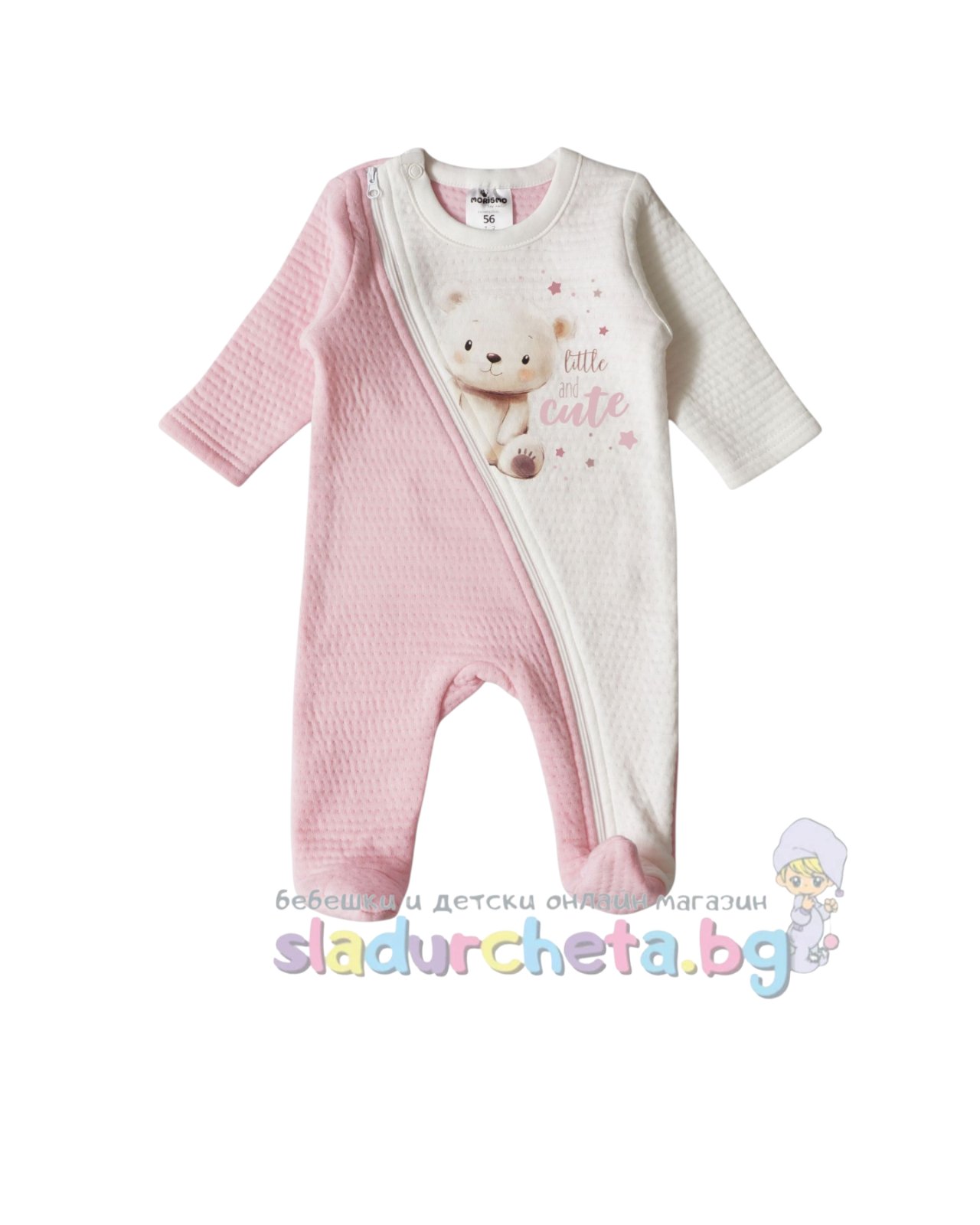 Гащеризонът е с дълъг ръкав в розов и бял цвят с апликация на мече;