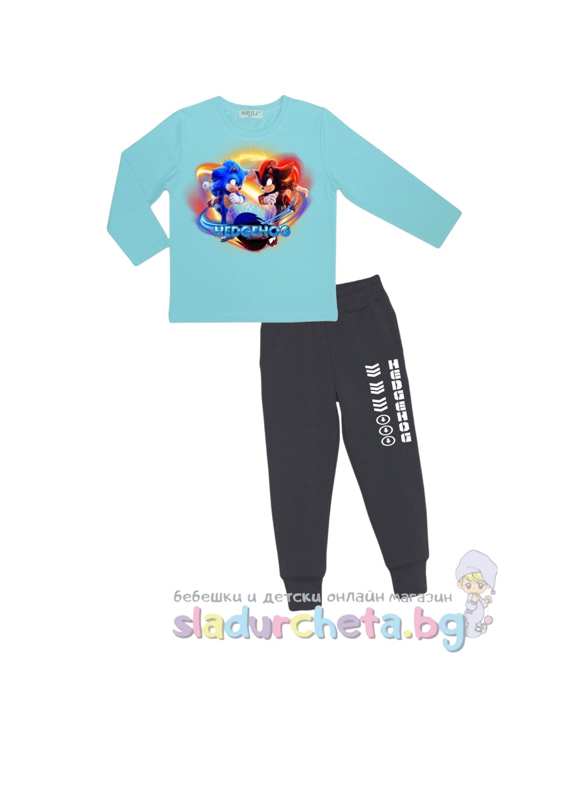 Блузата е с дълъг ръкав в светлосин цвят с цветна апликация на Соник;