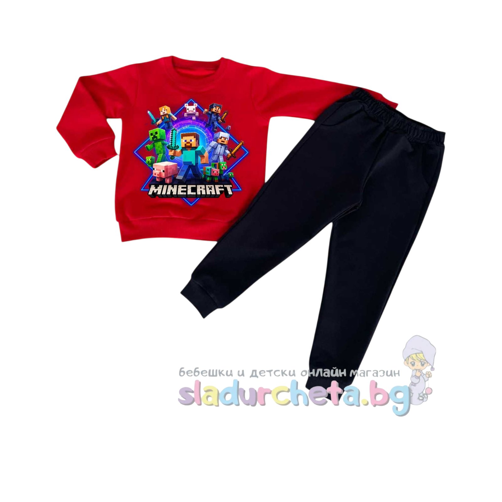 Блузата е с дълъг ръкав в червен цвят с цветна апликация на Minecraft;