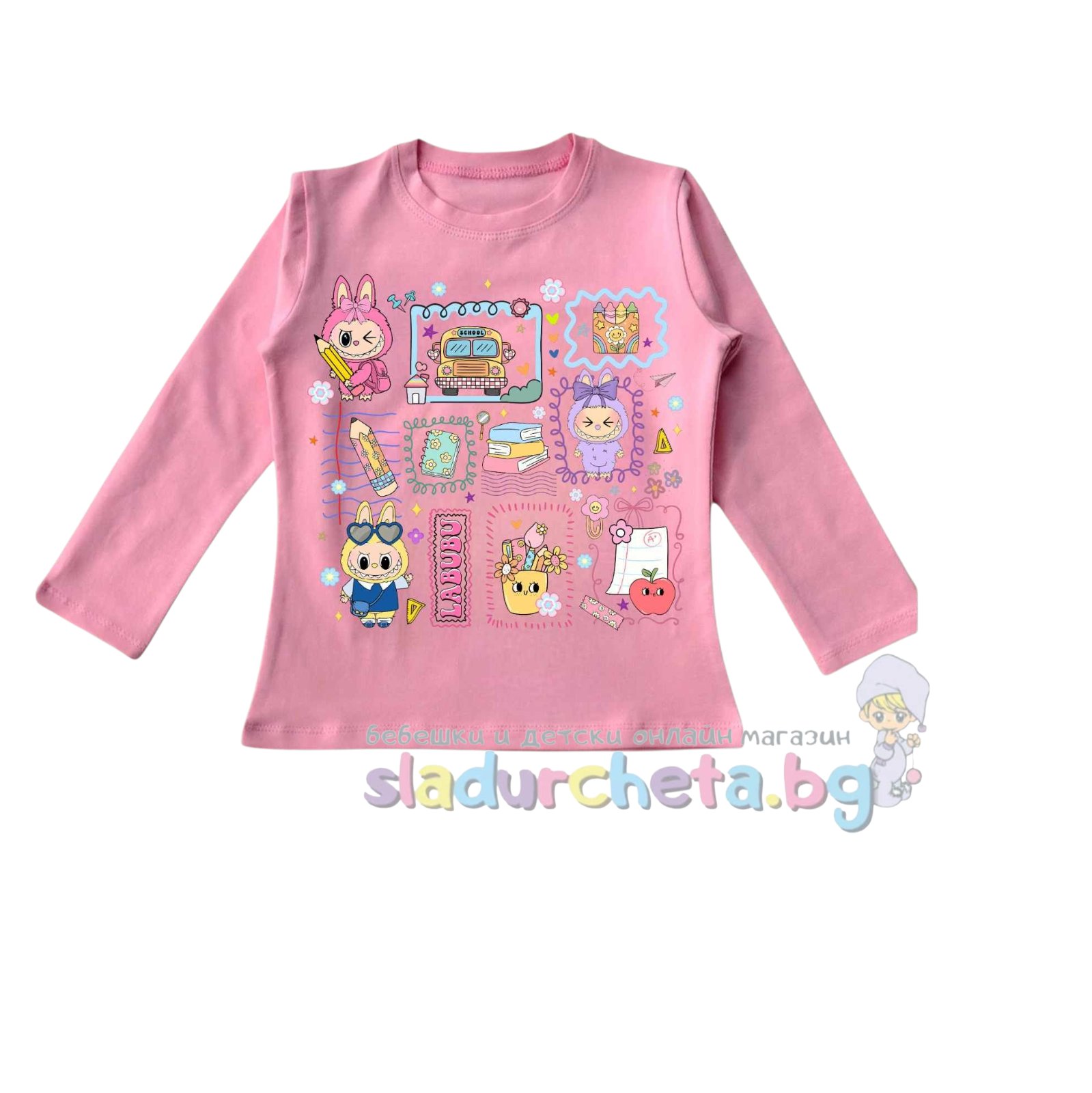 Блузата е с дълъг ръкав в розова цвят с цветна картинка;