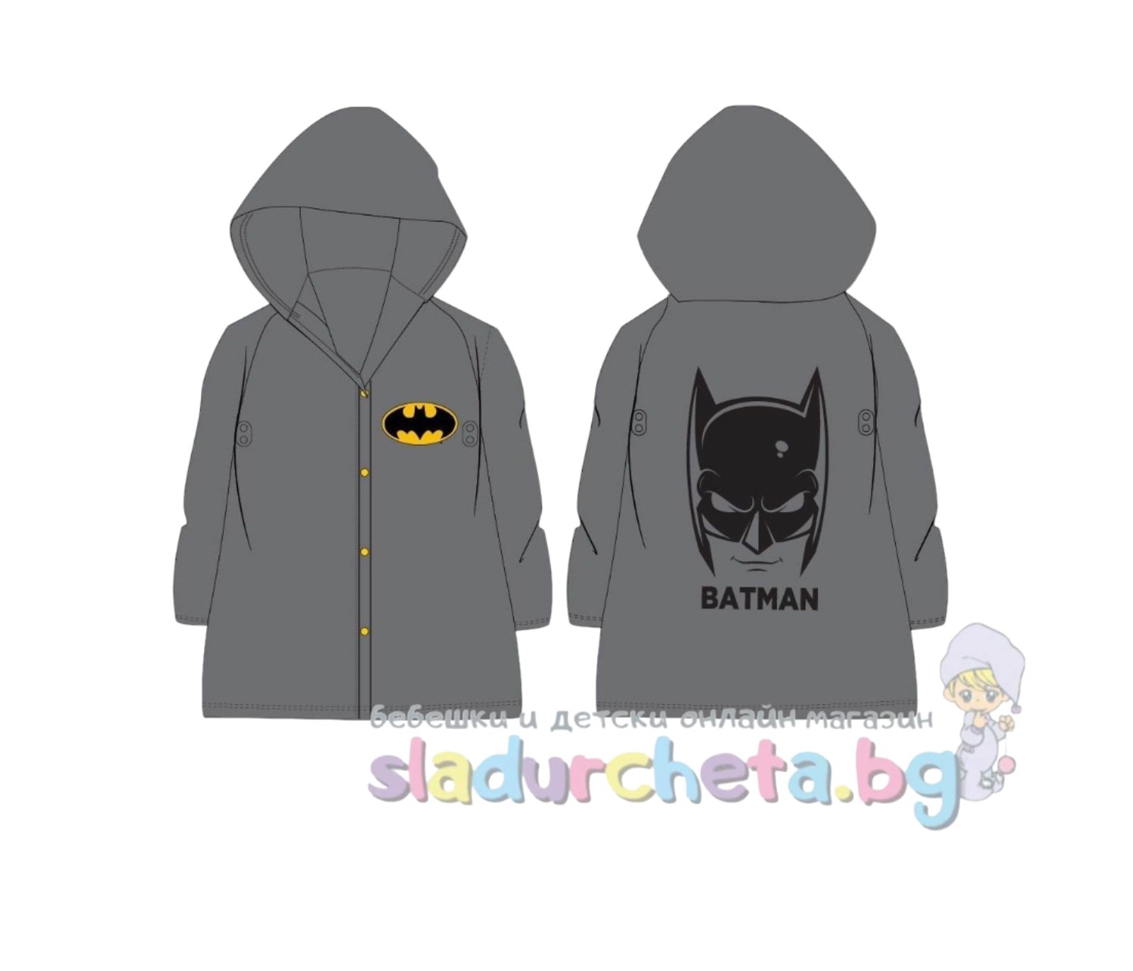 Дъждобранът е водоустойчив с качулка, с дълък ръкав и джоб;