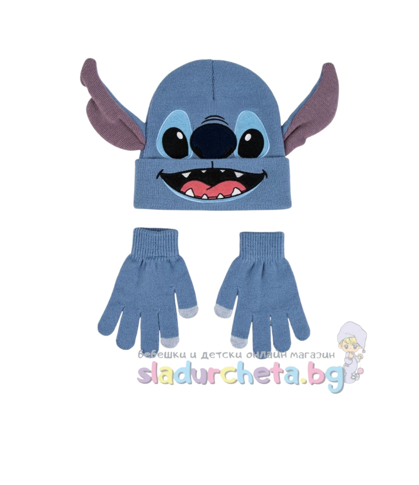 Шапката е в син цвят с цветна апликация на Стич с ушички;