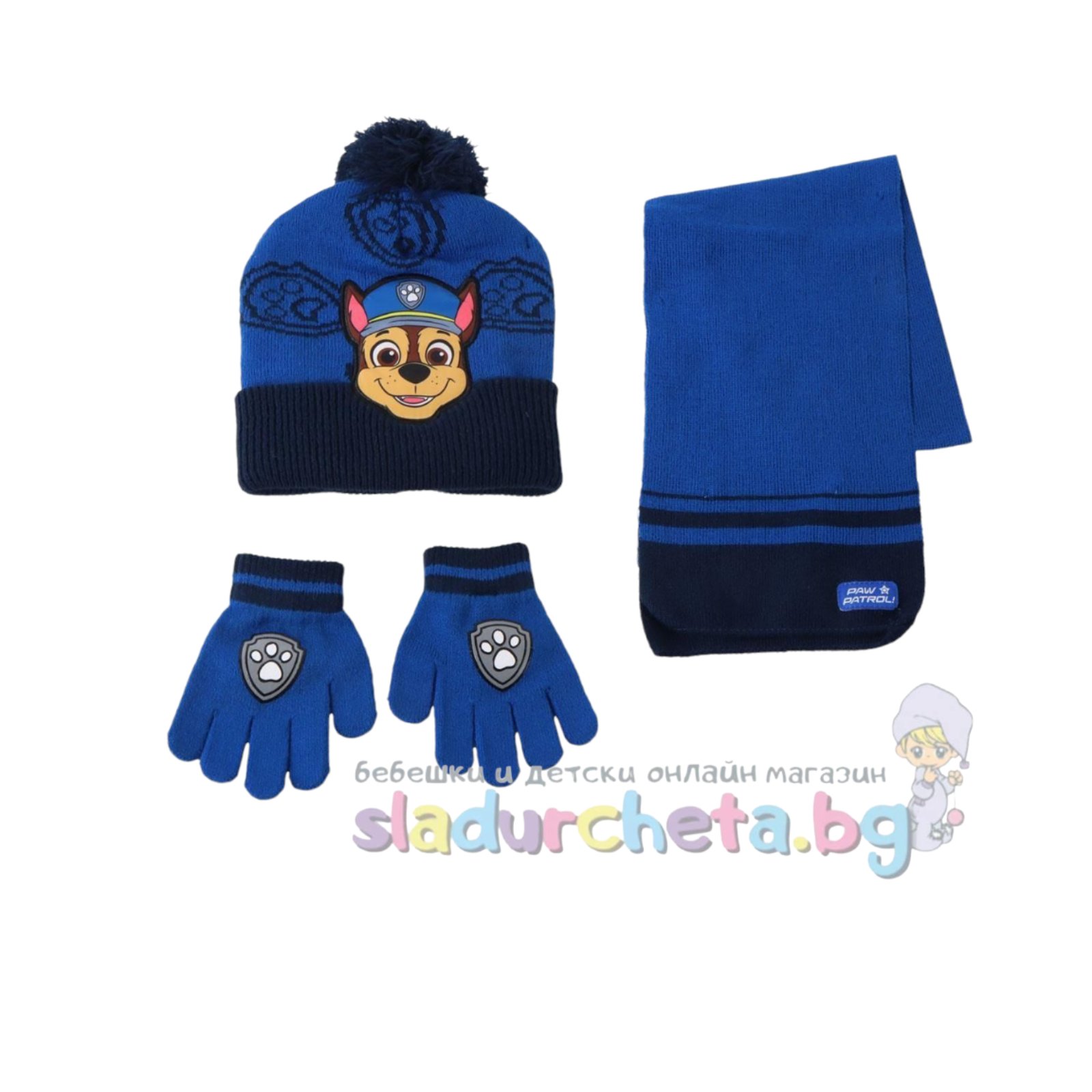 Шапката е в син цвят с цветна апликация на Пес Патрул и един помпон;
