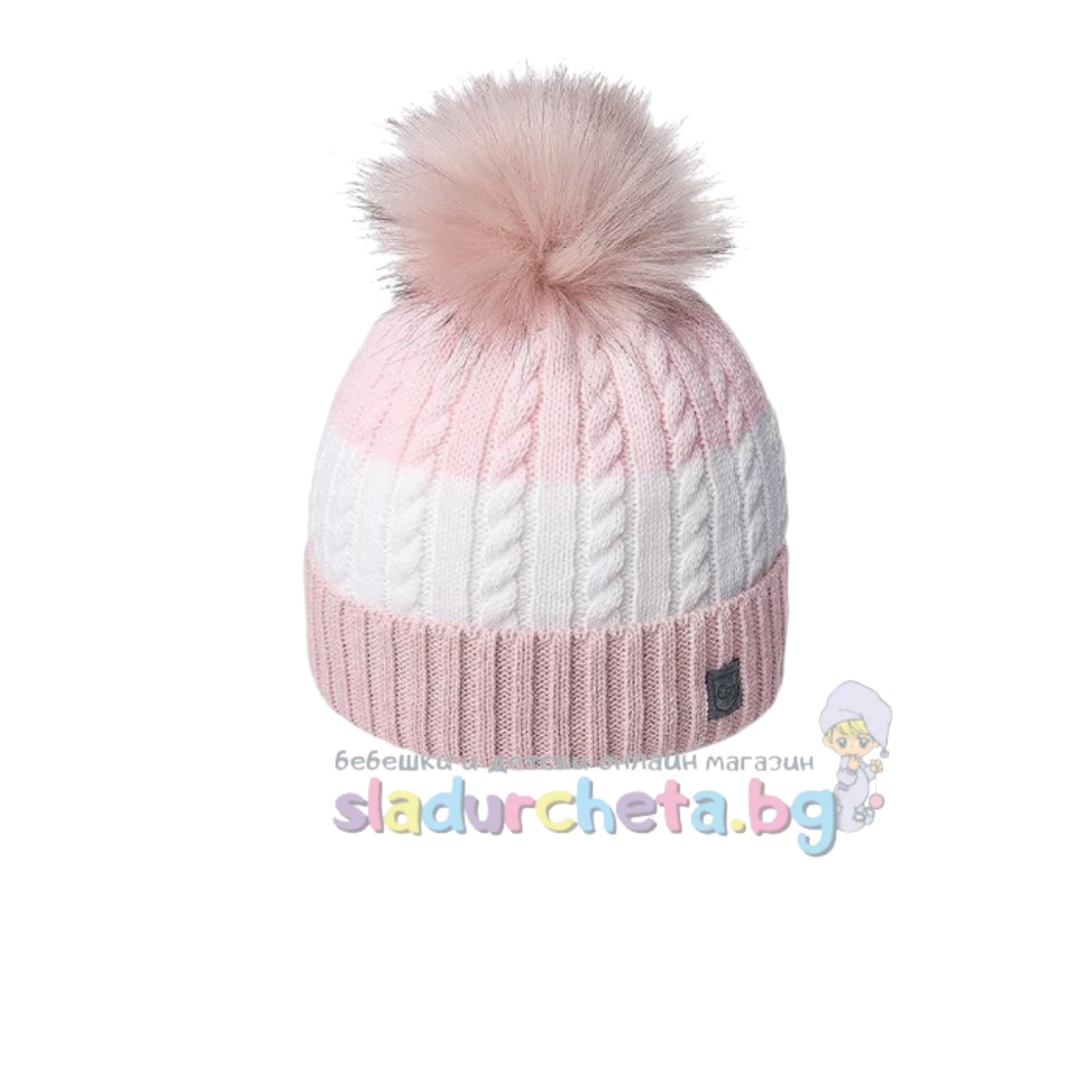 Шапката е в розов цвят с бяла лента с акцент голям помпон;