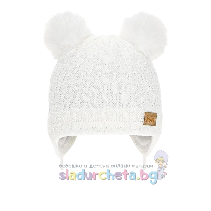 Шапката е в бял цвят с акцент два помпона;