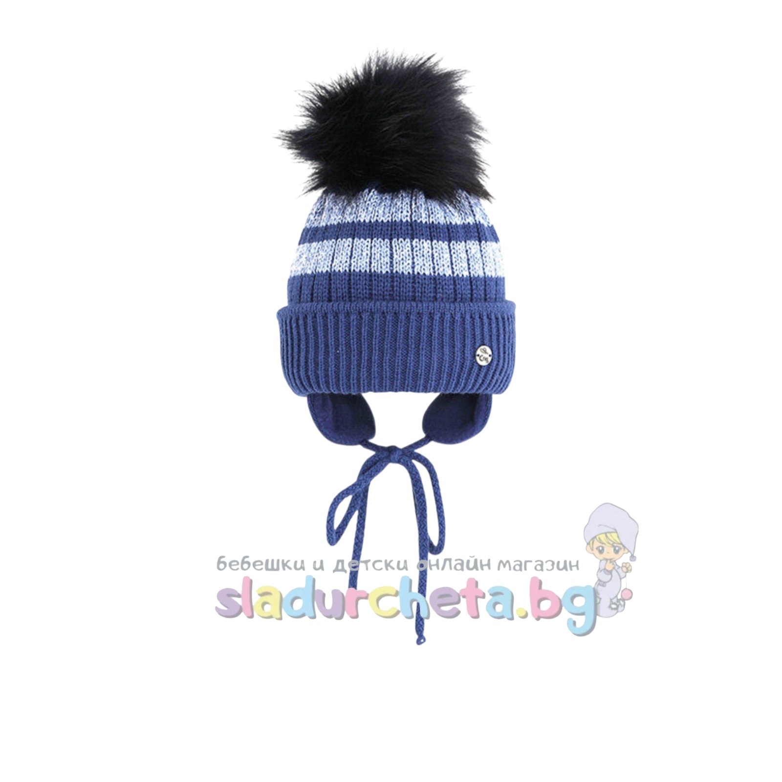 Шапката е в син цвят с акцент голям помпон и връзки;