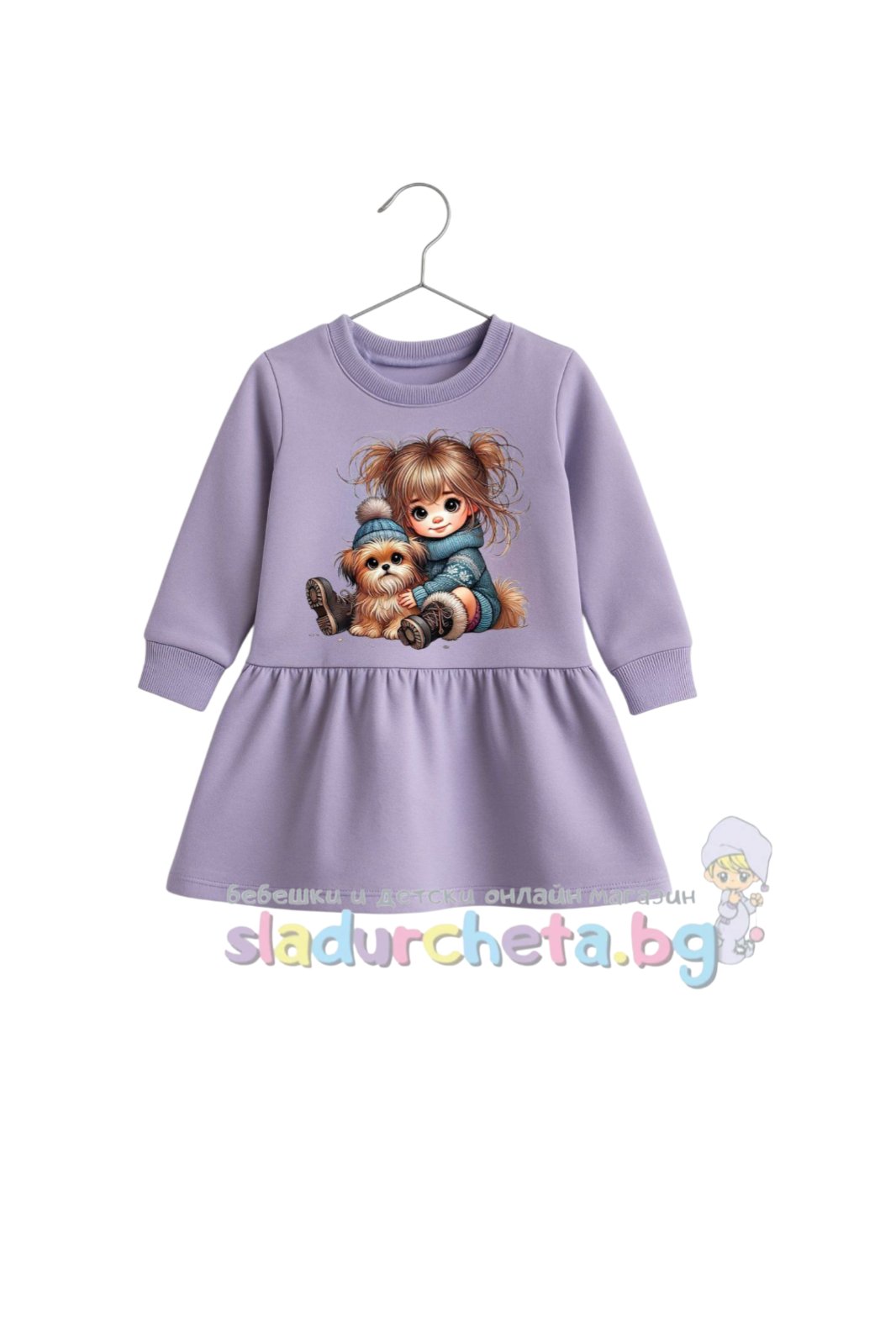 Роклята е с дълъг ръкав в лилав цвят с цветна картинка;