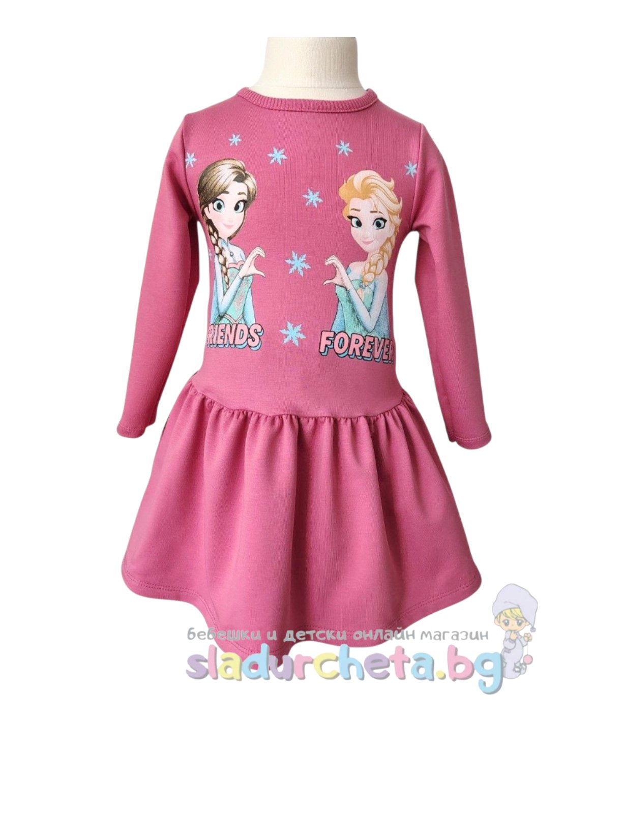 Роклята е с дълъг ръкав в тъмнорозов цвят с цветна апликация на Елза и Анна;