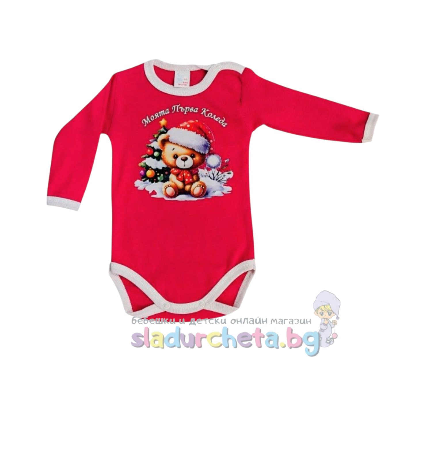 Бодито е с дълъг ръкав в червен цвят с коледна апликация;