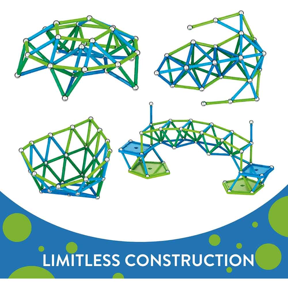 • Гениална, но проста конструктивна система с магнитни части, които можете да използвате, за да създадете безкраен брой фигури и триизмерни конструкции;