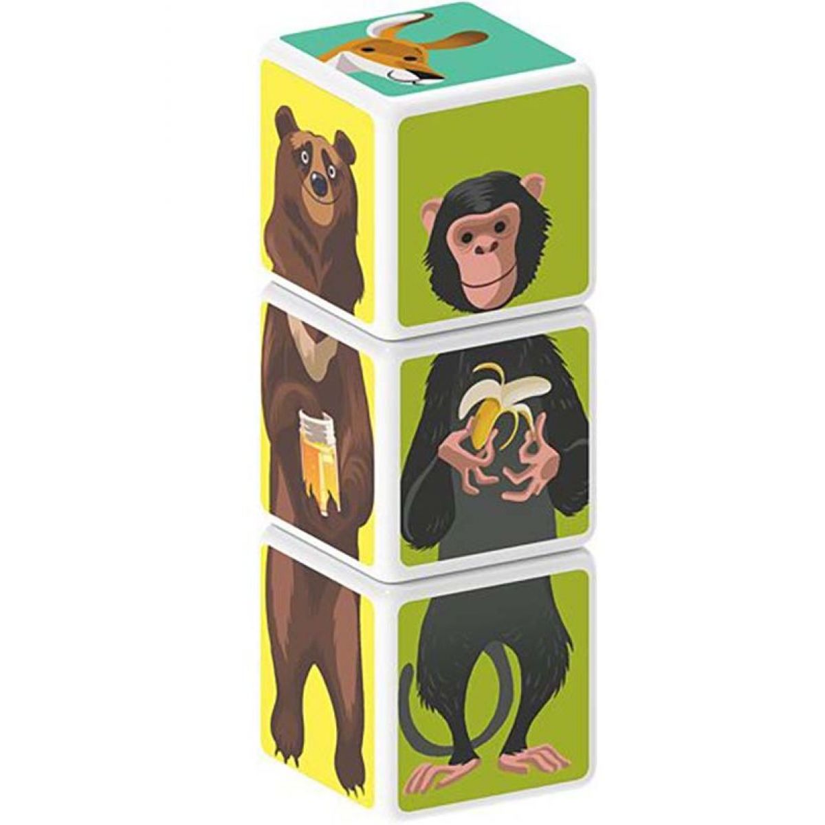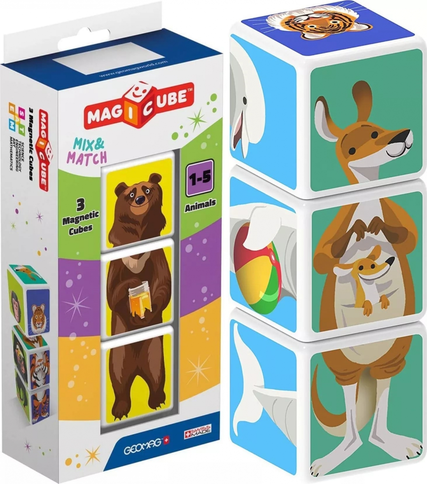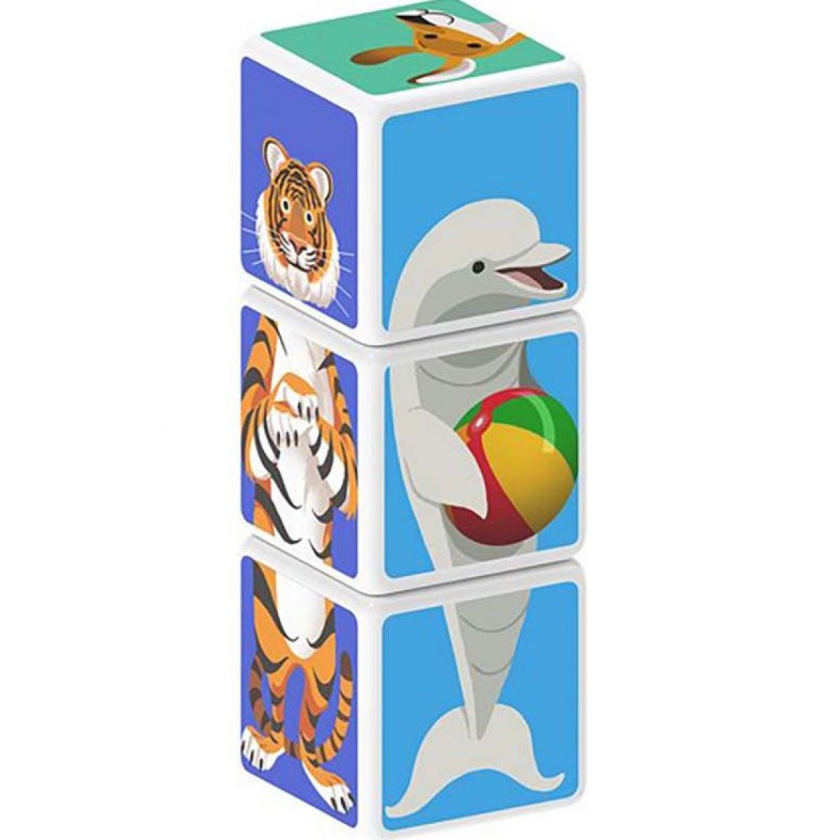 Съдържа 3 магнитни кубчета за създаване на 6 различни животни: мечка, маймуна, делфин, кенгуру, тигър, орел;