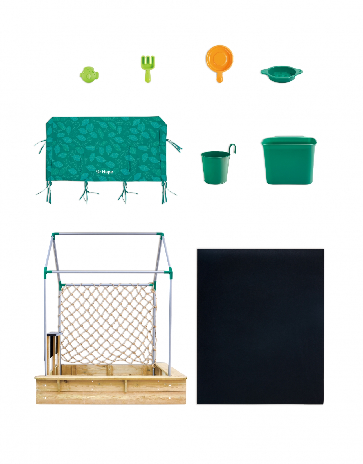 • Този универсален комплект съчетава пясъчник, кухня, саксия, статив и уютен, подвижен покрив;