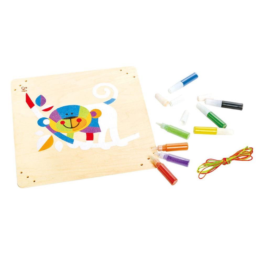 Комплектът съдържа общо 11 части - основа, 8 цвята пясък, цветни шнурове за декорация;