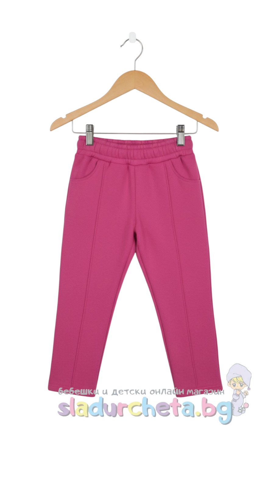 Панталонът е в цвят циклама с два джоба и ластична част на талията;