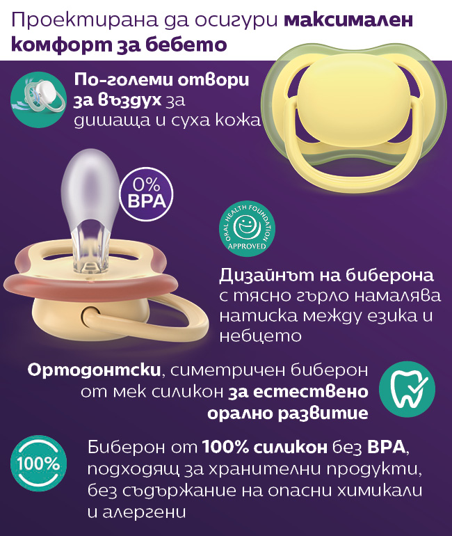 Симетричен и мек силиконов биберон подпомага естествените движения на устните мускули и здравословното развитие на устната кухина на бебето;