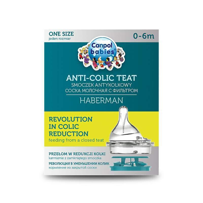 Биберонът се използва с шише Habeman, като по този начин се избягва поглъщането на въздух - основната причина за коликите