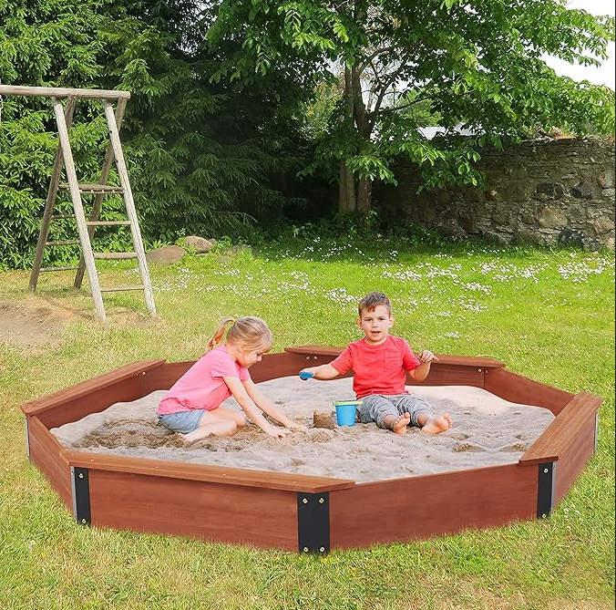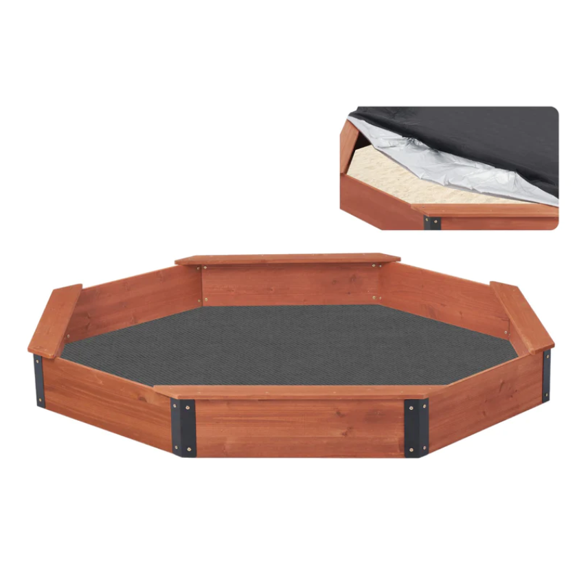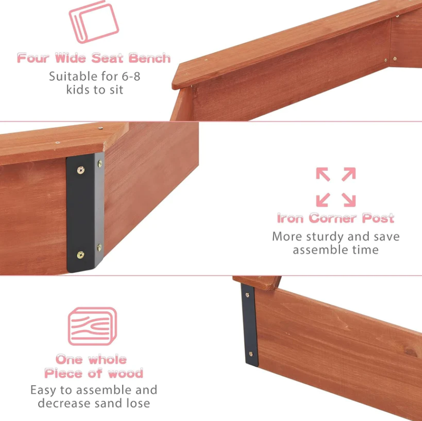 Дървен осмоъгълен пясъчник, който е проектиран за издръжливост, стабилност и безопасност, със здрави дървени панели, свързани с метални стълбове, за да издържат на атмосферни условия на открито и на груба игра;