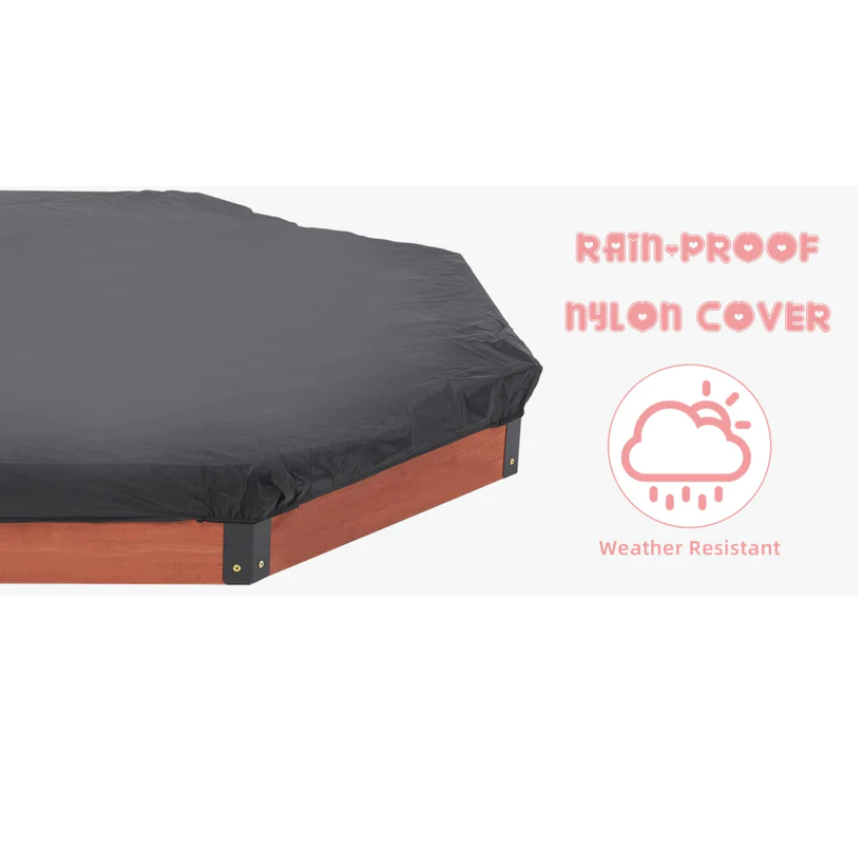 В комплекта е включено найлоново покривало, което е устойчиво на дъжд и долна подплата, за да поддържа пясъка чист и сух;