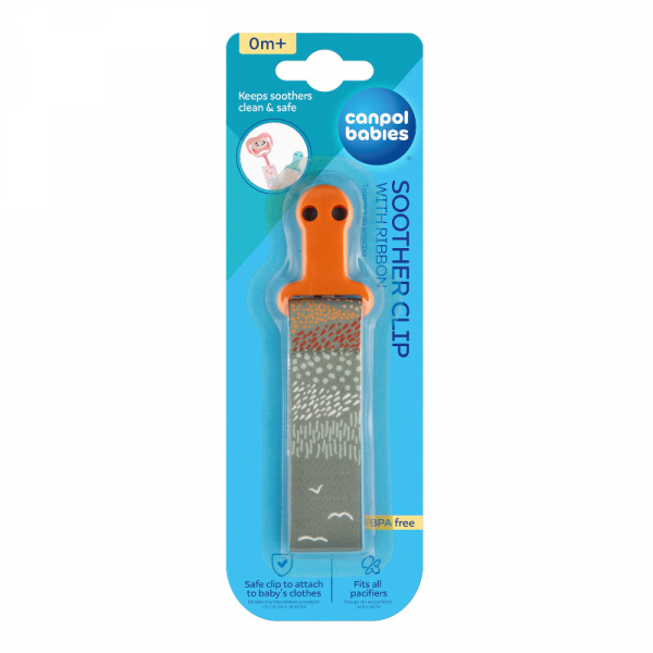 Клипсът за залъгалка Canpol с лента е безопасен и издръжлив;