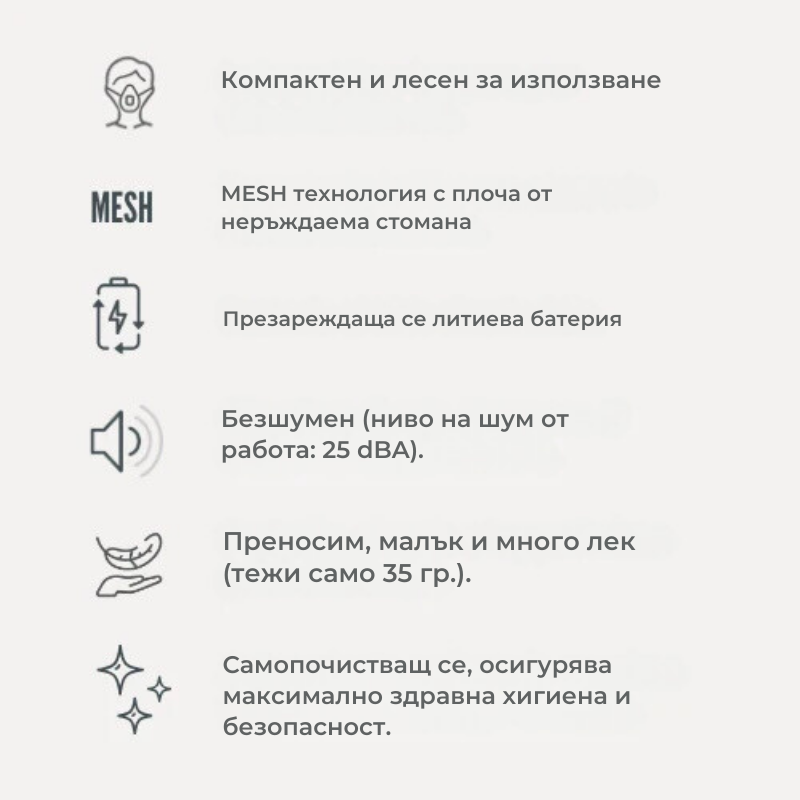 След всяка употреба устройството се почиства автоматично, като се изисква само измиване на маската;