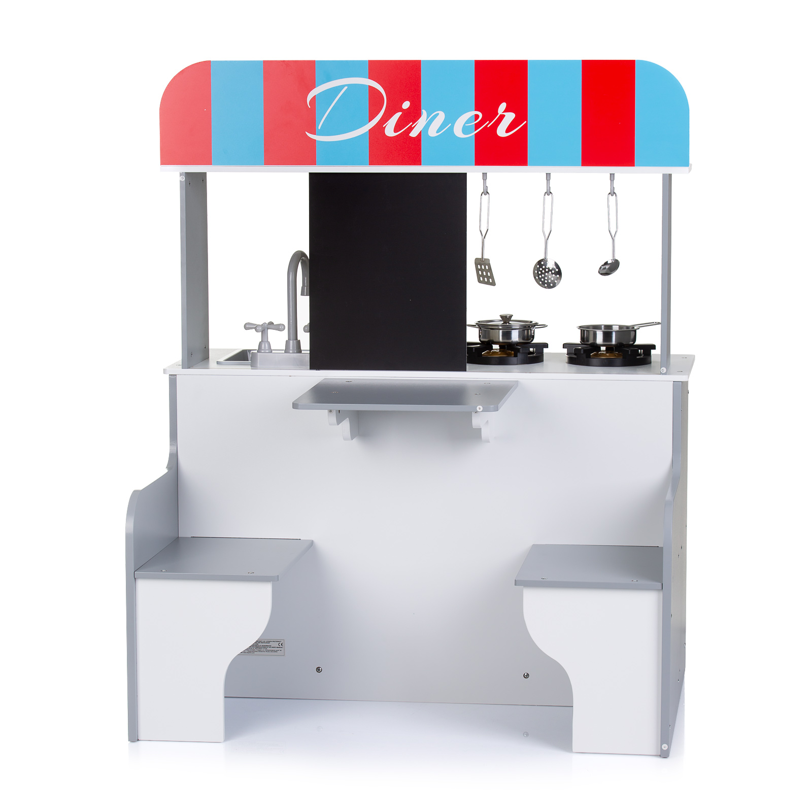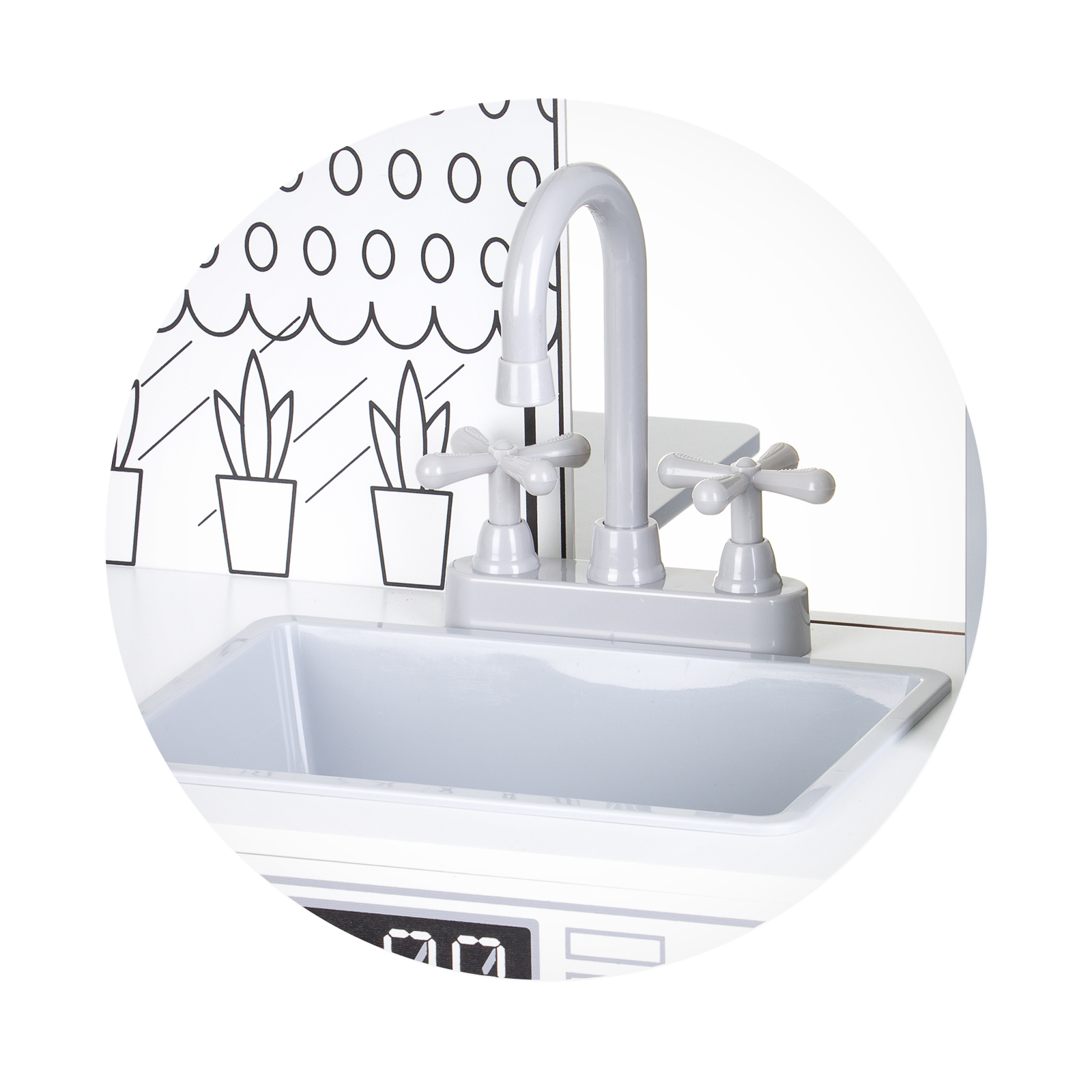 Оборудвано с реалистични уреди – мивка, плот за приготвяне на храна, котлони, шкафове за съхранение с отваряеми вратички, комплект от 5 метални кухненски прибори и тенджери;
