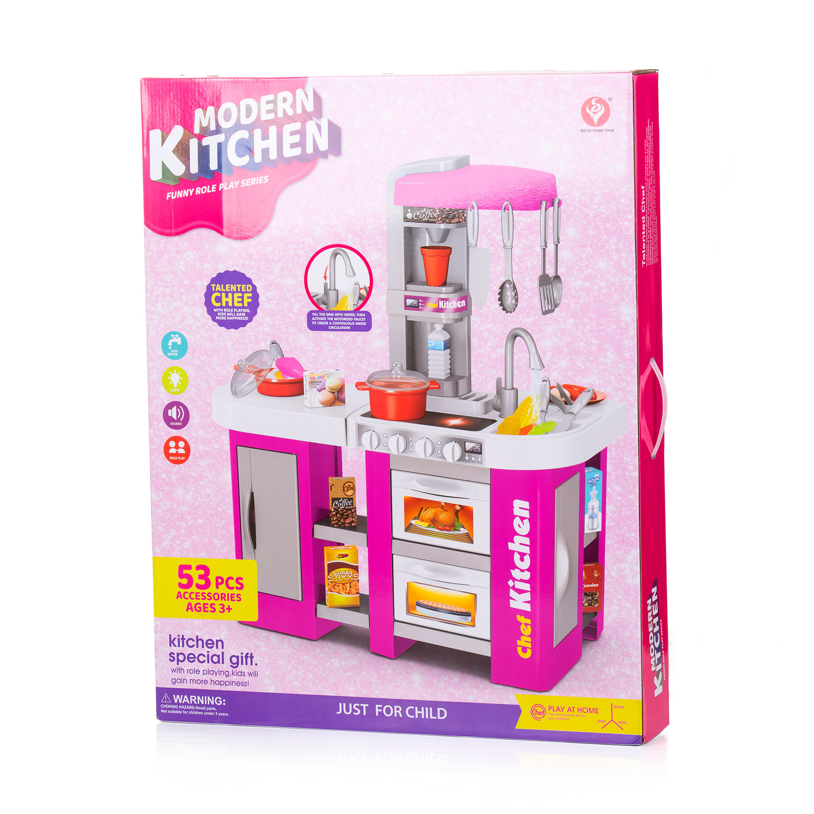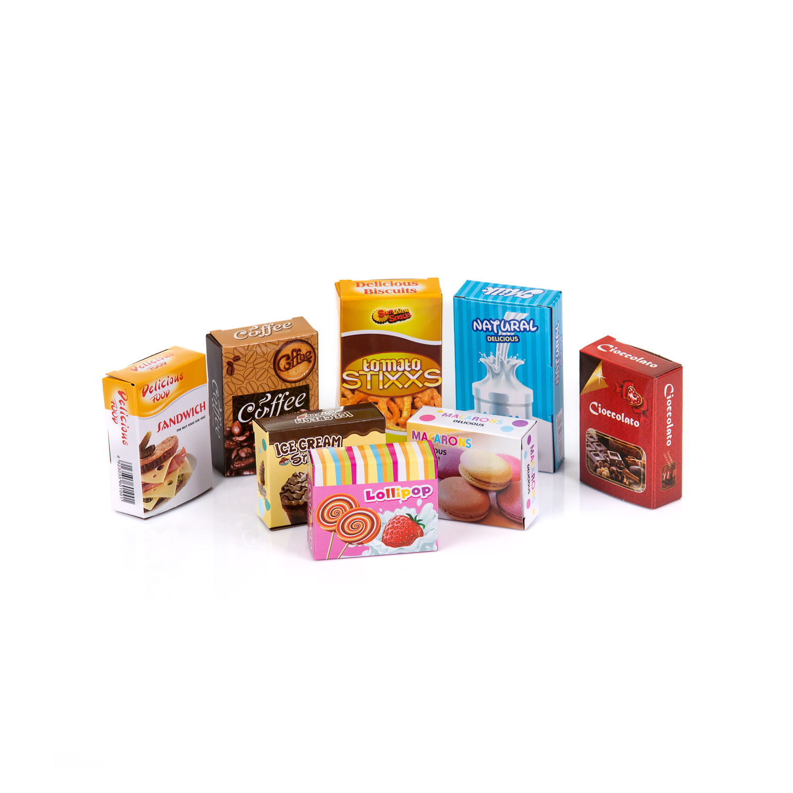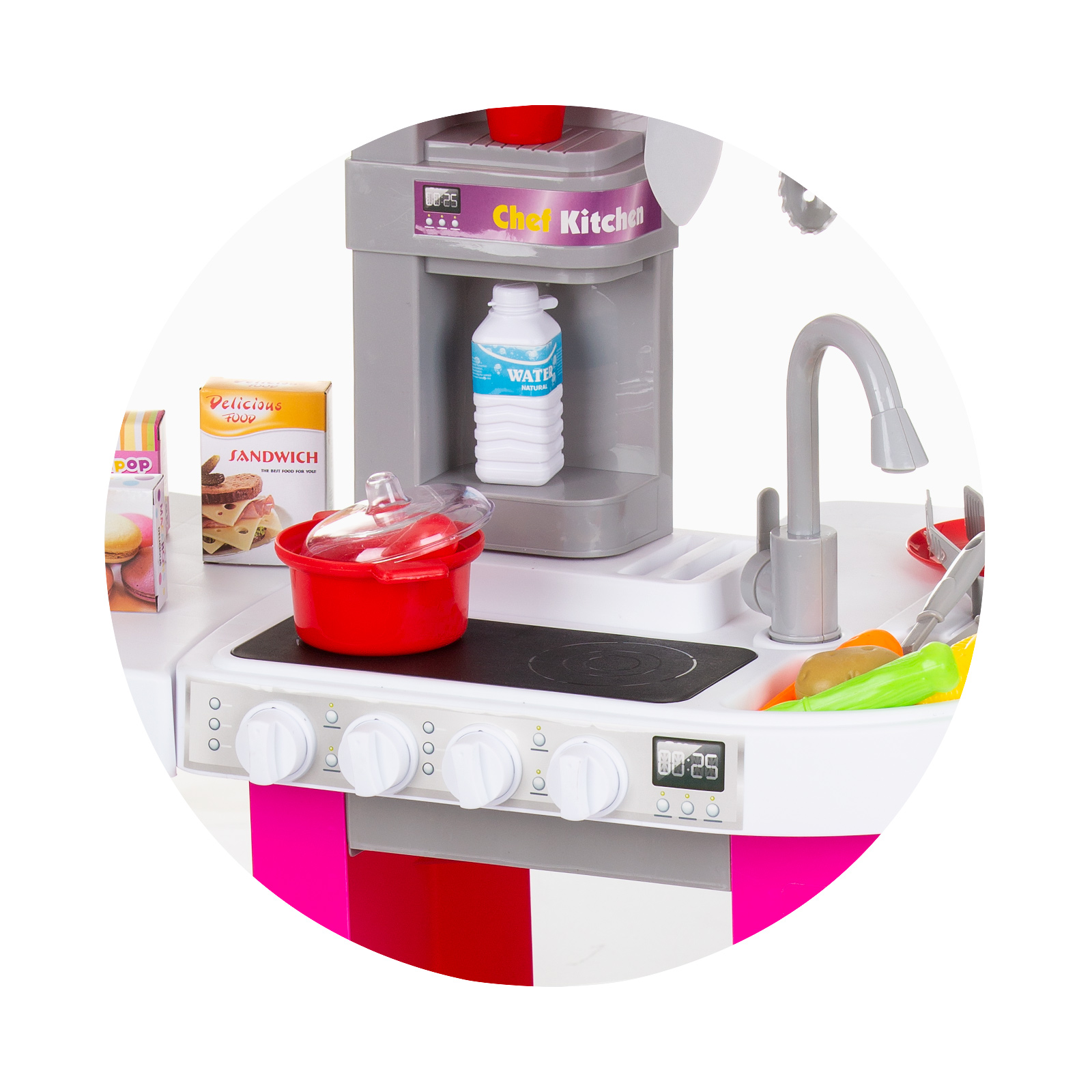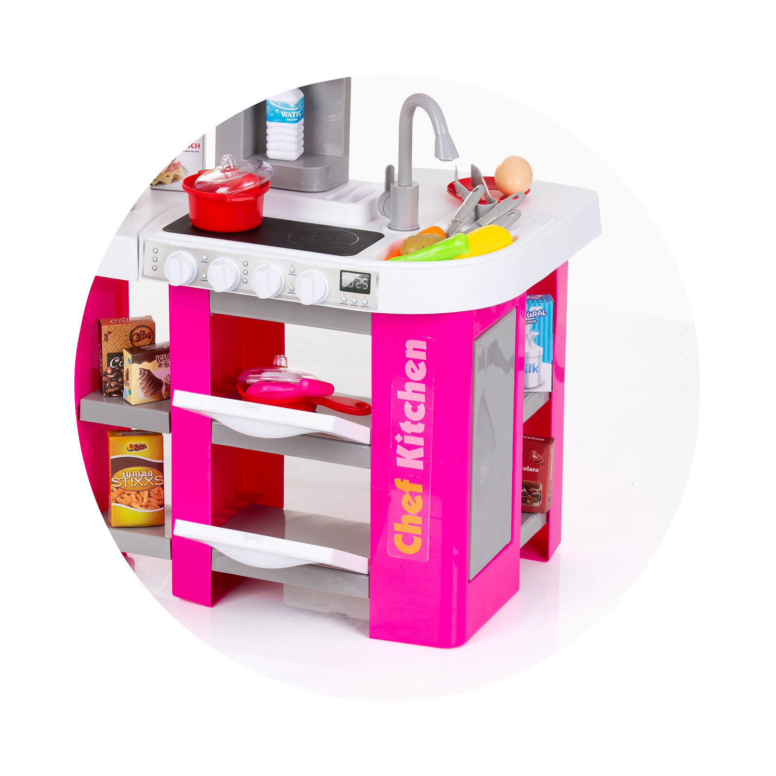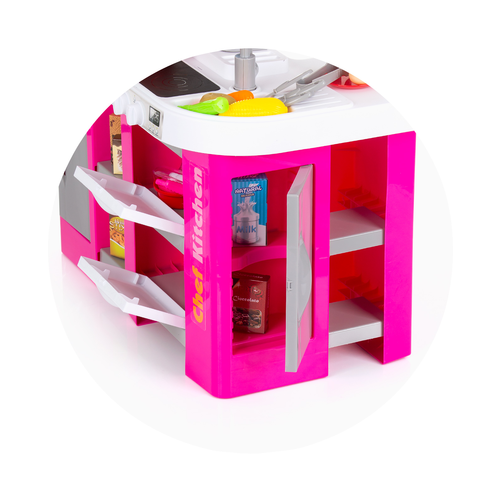 Разнообразие от 53 цветни и реалистични аксесоари - във формата на различни видове хранителни продукти (зеленчуци, плодове, кутии сок, снакс, риба, месо и други) , както и богат набор от кухненски съдове и прибори (тенджера, тиган, чинийка, чашка, пособия за готвене);