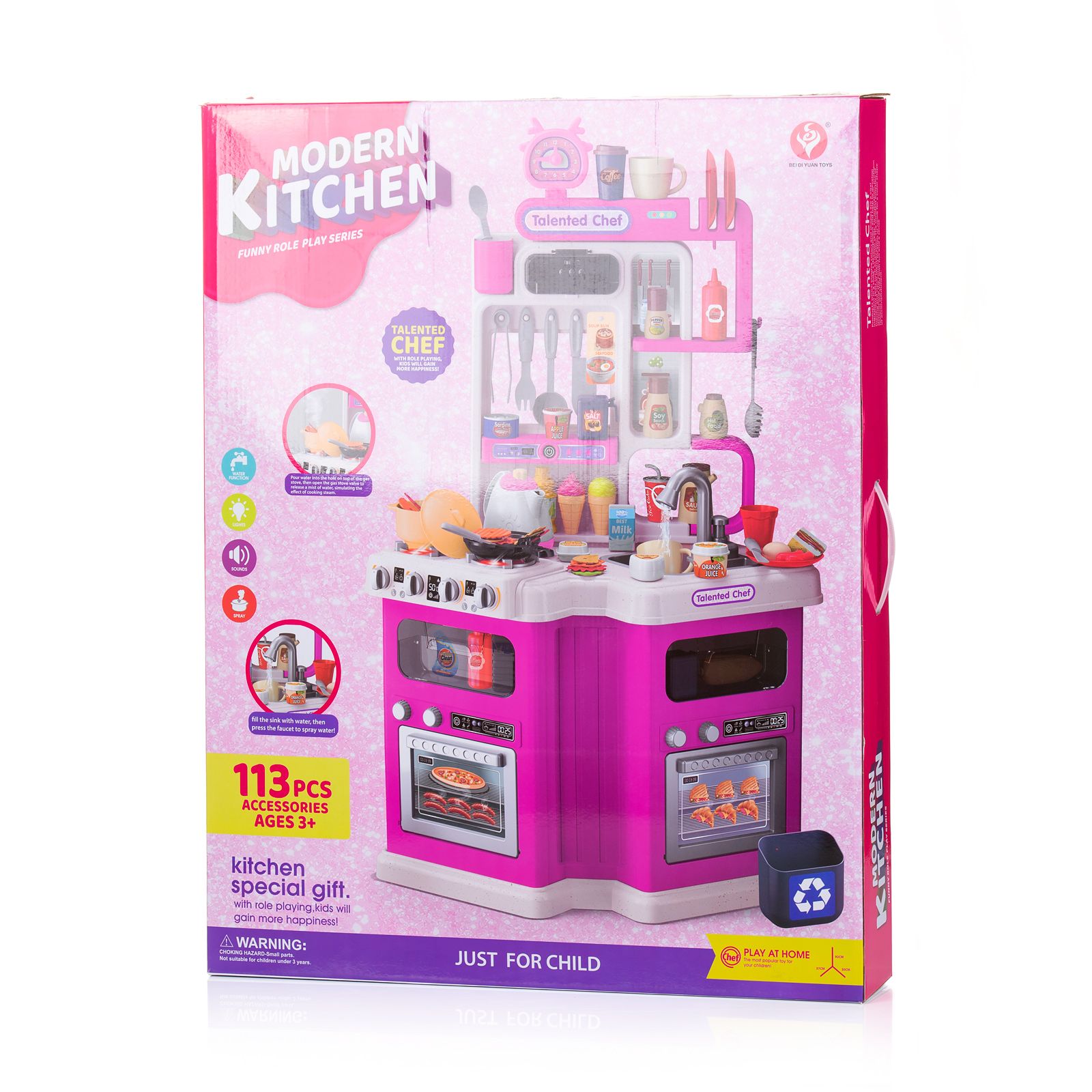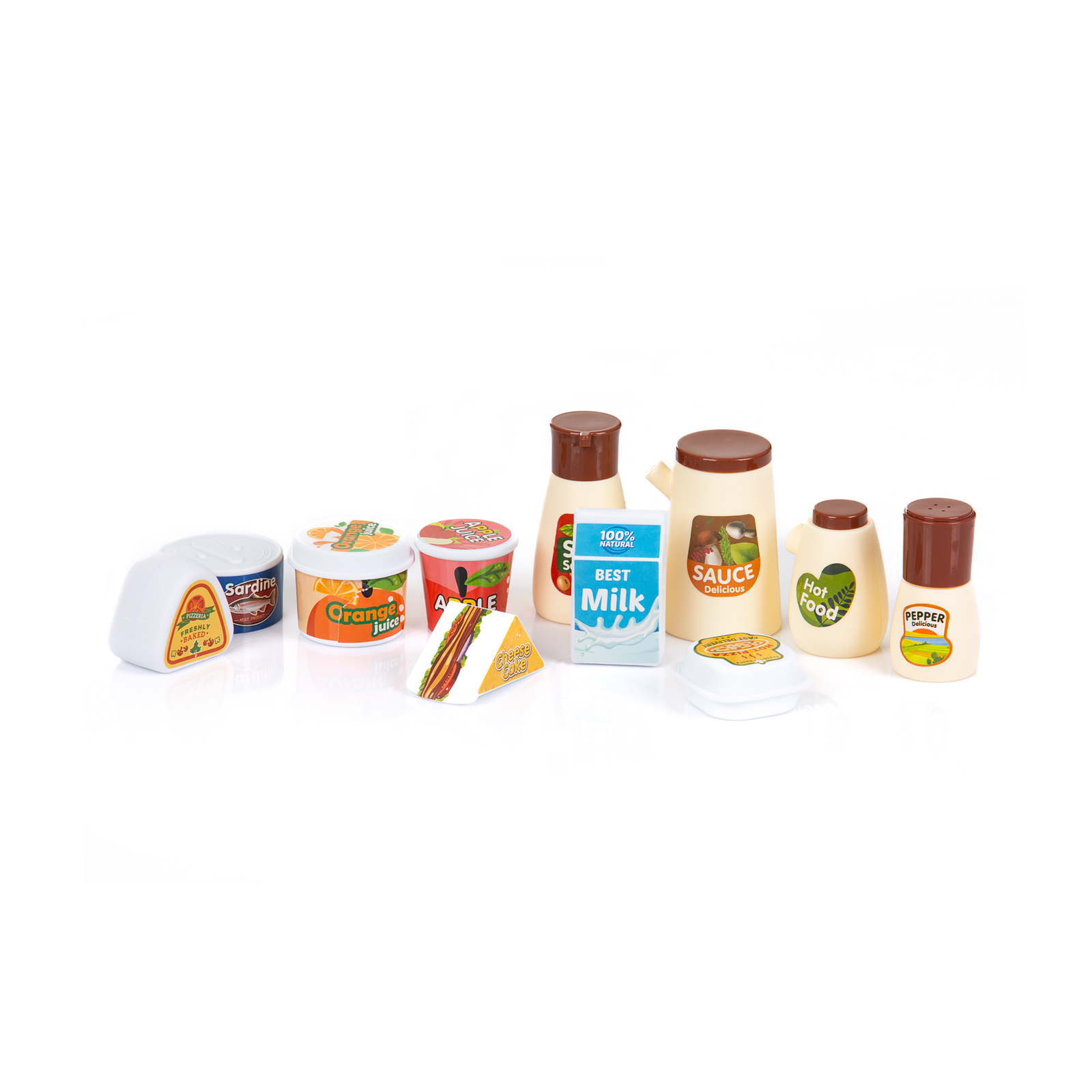 Разнообразие от 113 цветни и реалистични аксесоари - във формата на различни видове хранителни продукти (зеленчуци, плодове, кутии сок, снакс, сладолед и други) , както и богат набор от кухненски прибори (тиган, чинии, тенджера, чашки, шишенца за сос, чайник, различни по големина кани и съдове, и други) комплект прибори за готвене, кошчета за отпадъци и други)