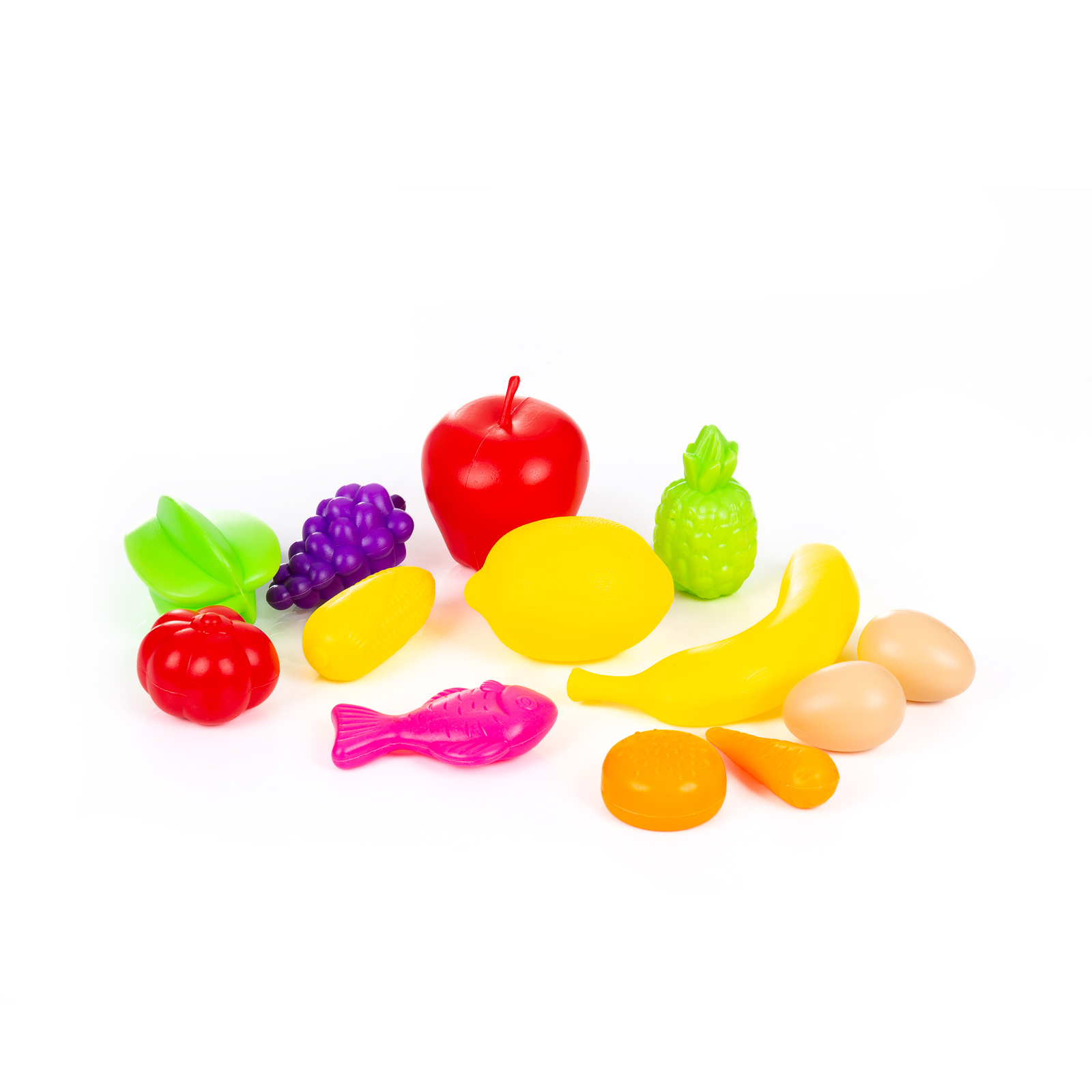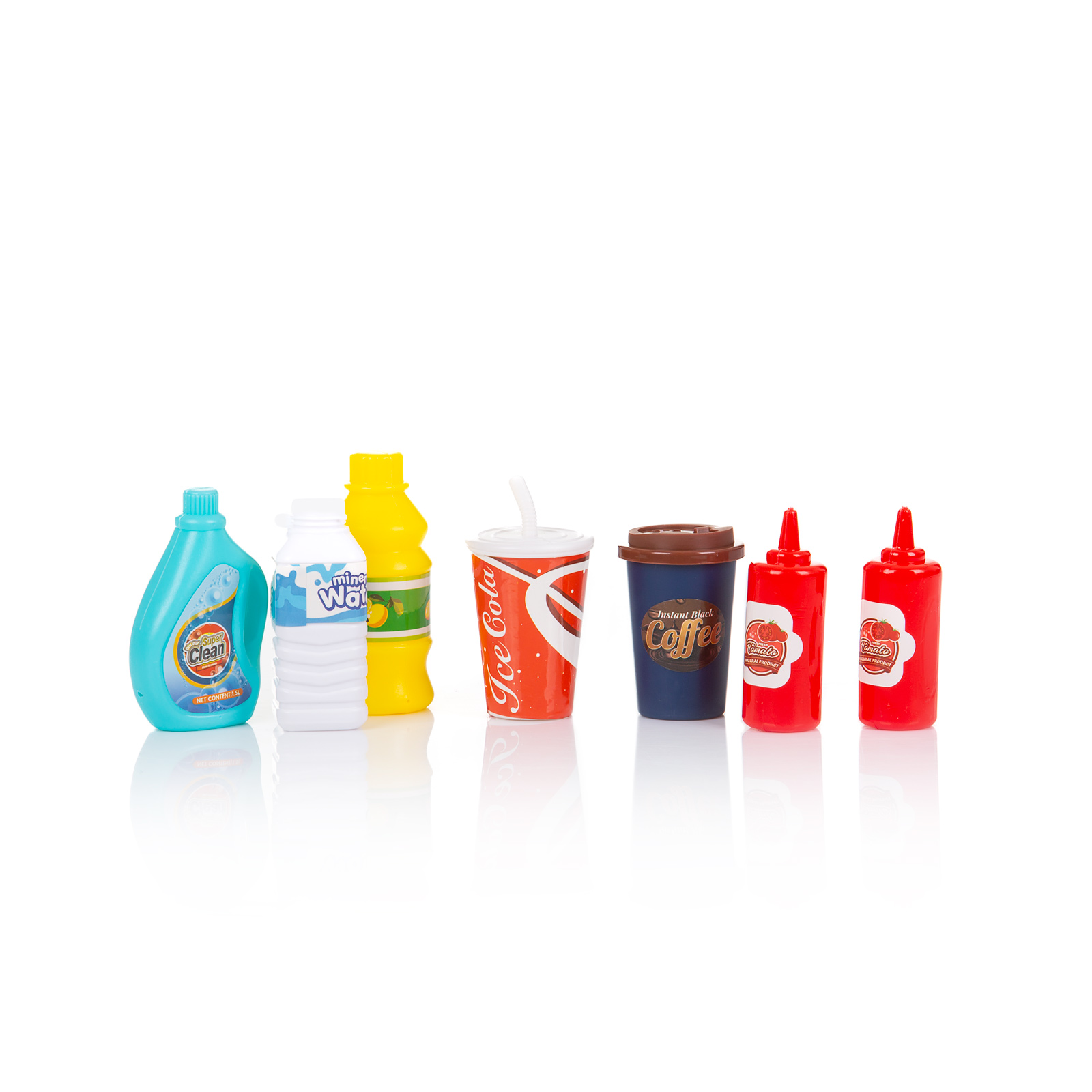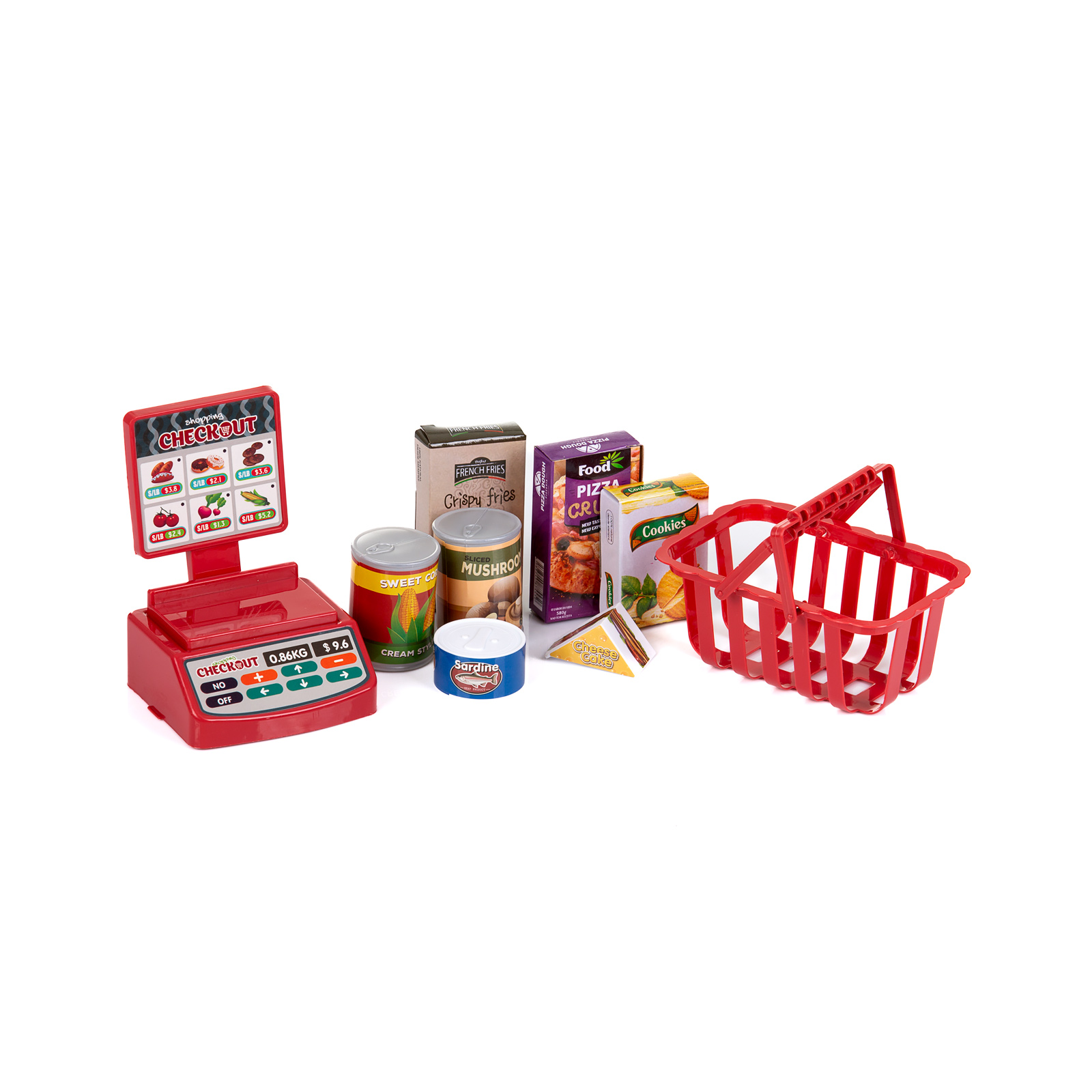 Разнообразие от аксесоари - 81 броя различни хранителни продукти за пазаруване (зеленчуци, плодове, напитки, снакс и други), както и банкноти, монети и кредитни карти;