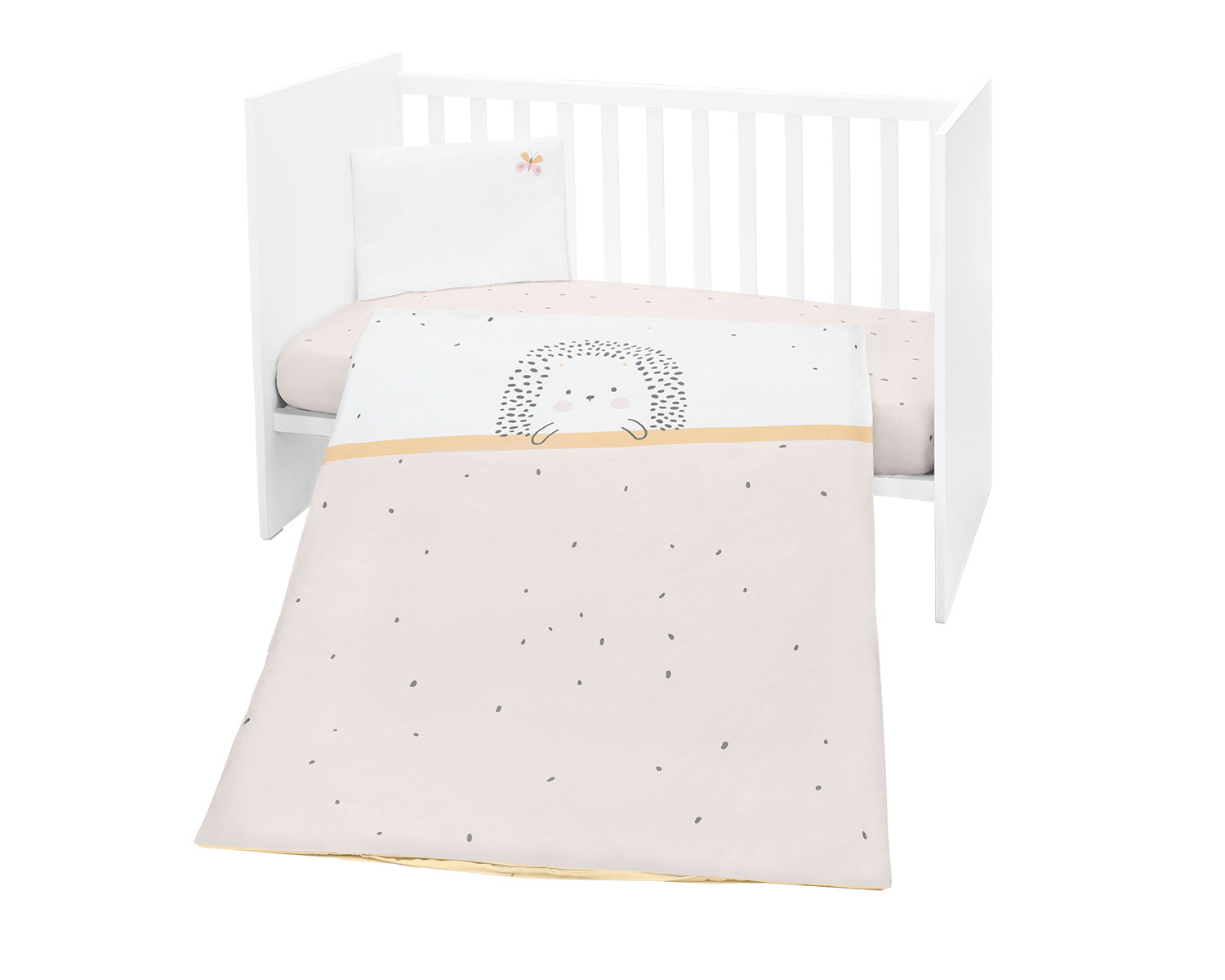 • Мек и нежен бебешки спален комплект; • Сертифицирани по OEKO-TEX материи; • Изработен от 100% висококачествен памук ранфорс; • Закачлив дизайнерски десен в нежни цветове; • Комплектът включва: