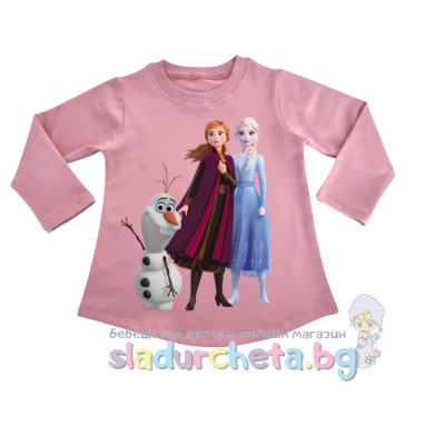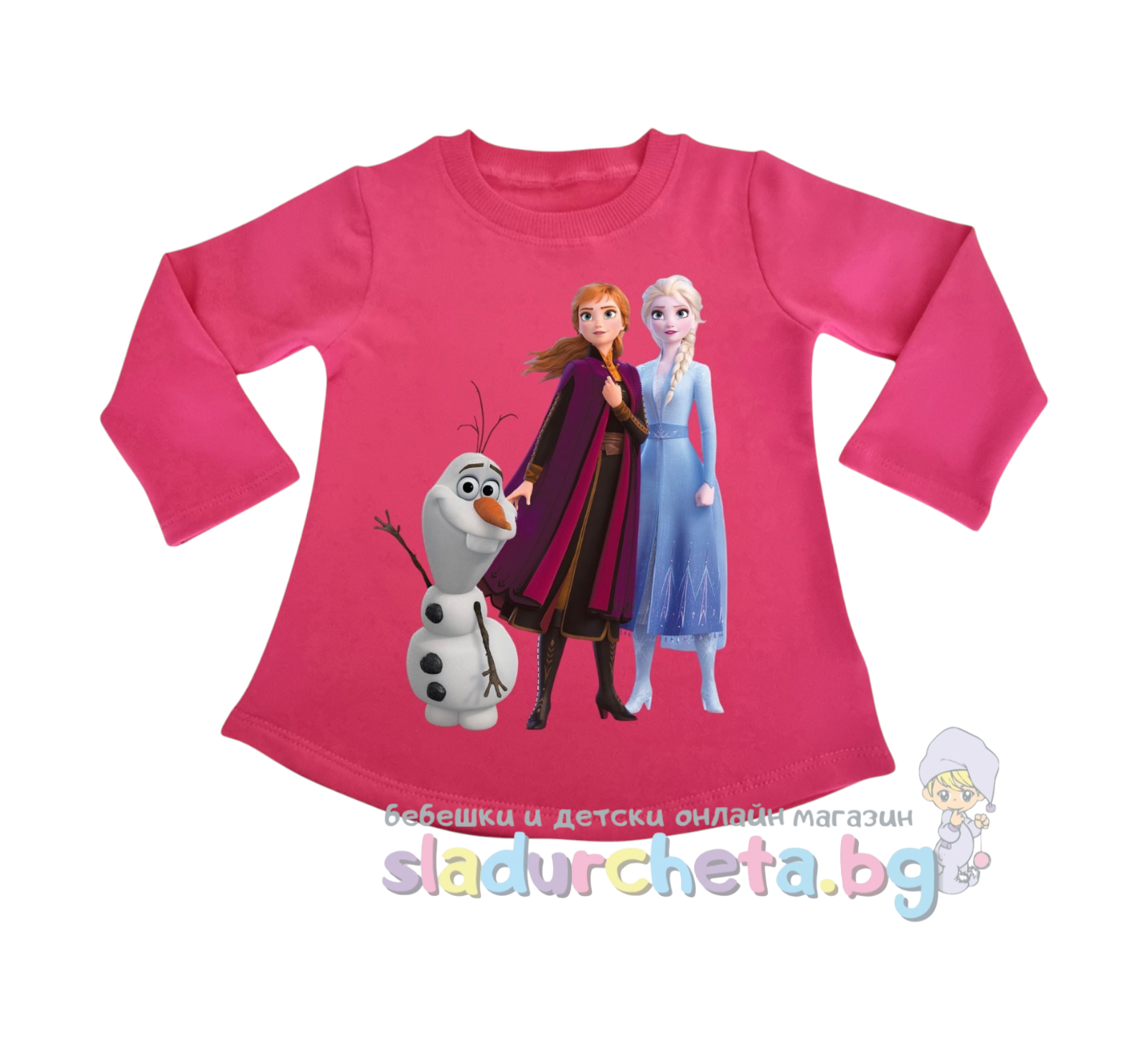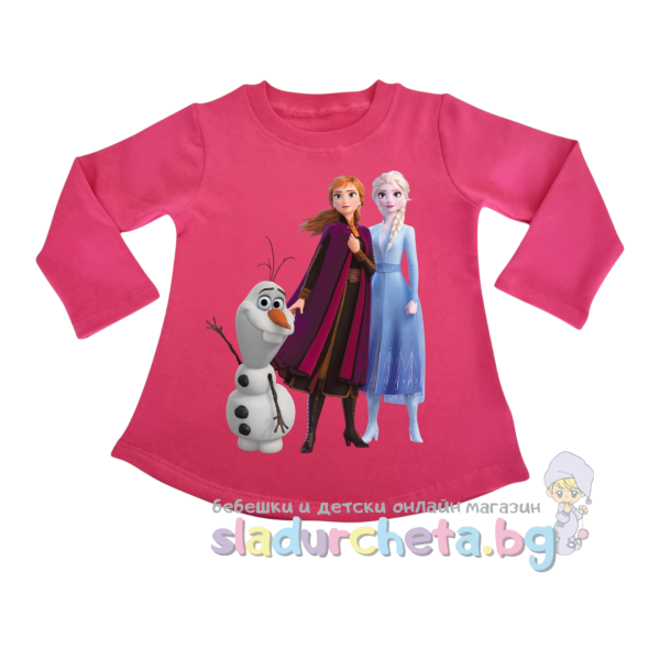 Блузата е с дълъг ръкав в цвят циклама и цветна апликация на Елза и Анна;