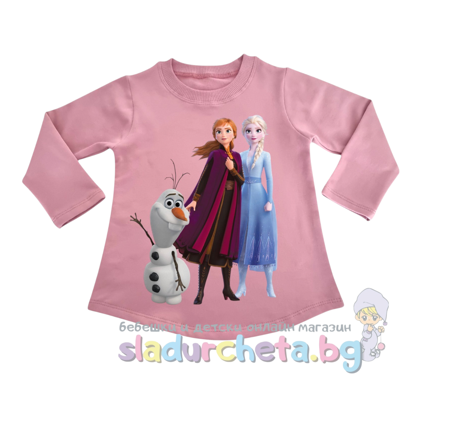 Блузата е с дълъг ръкав в цвят пудра и цветна апликация на Елза и Анна;